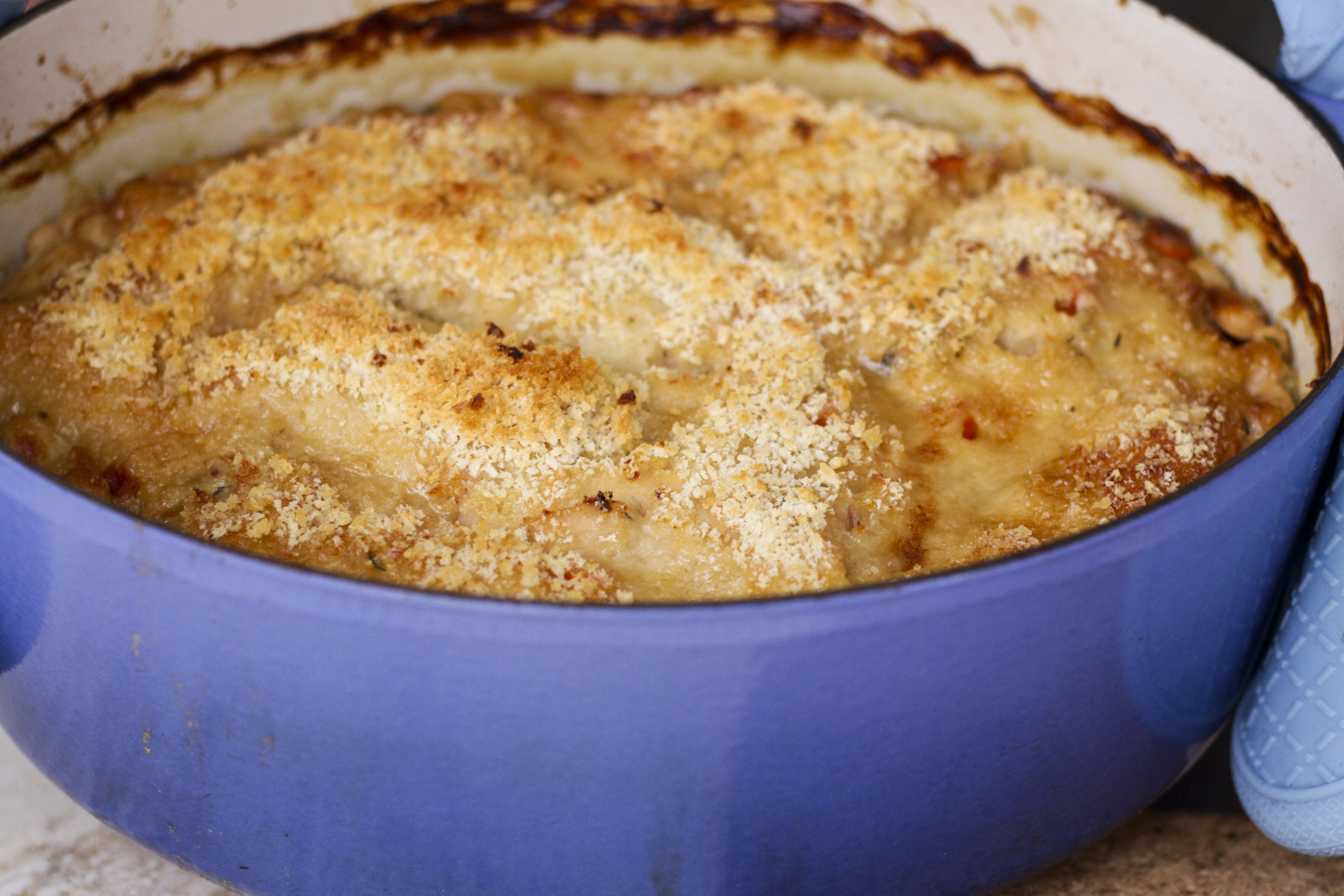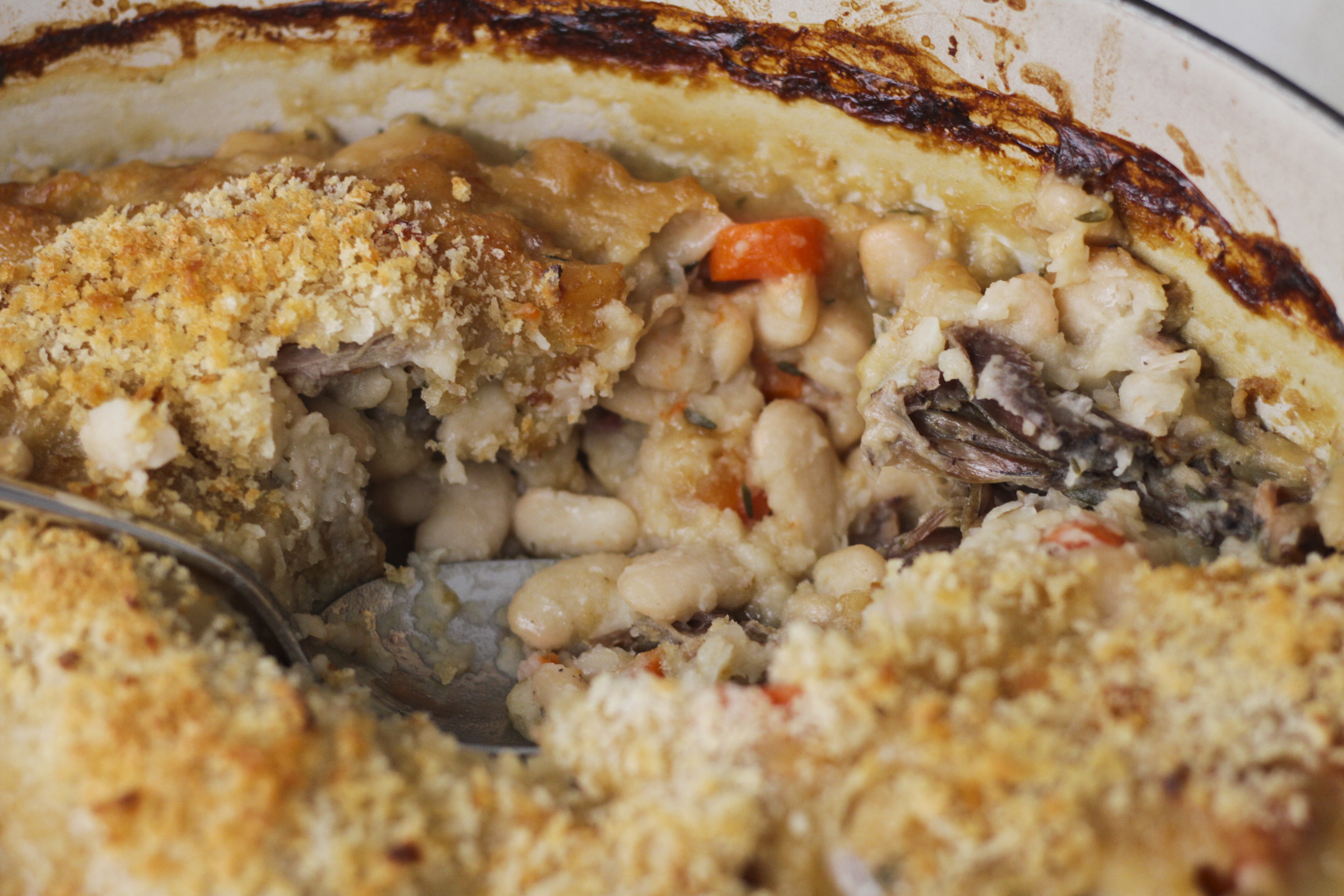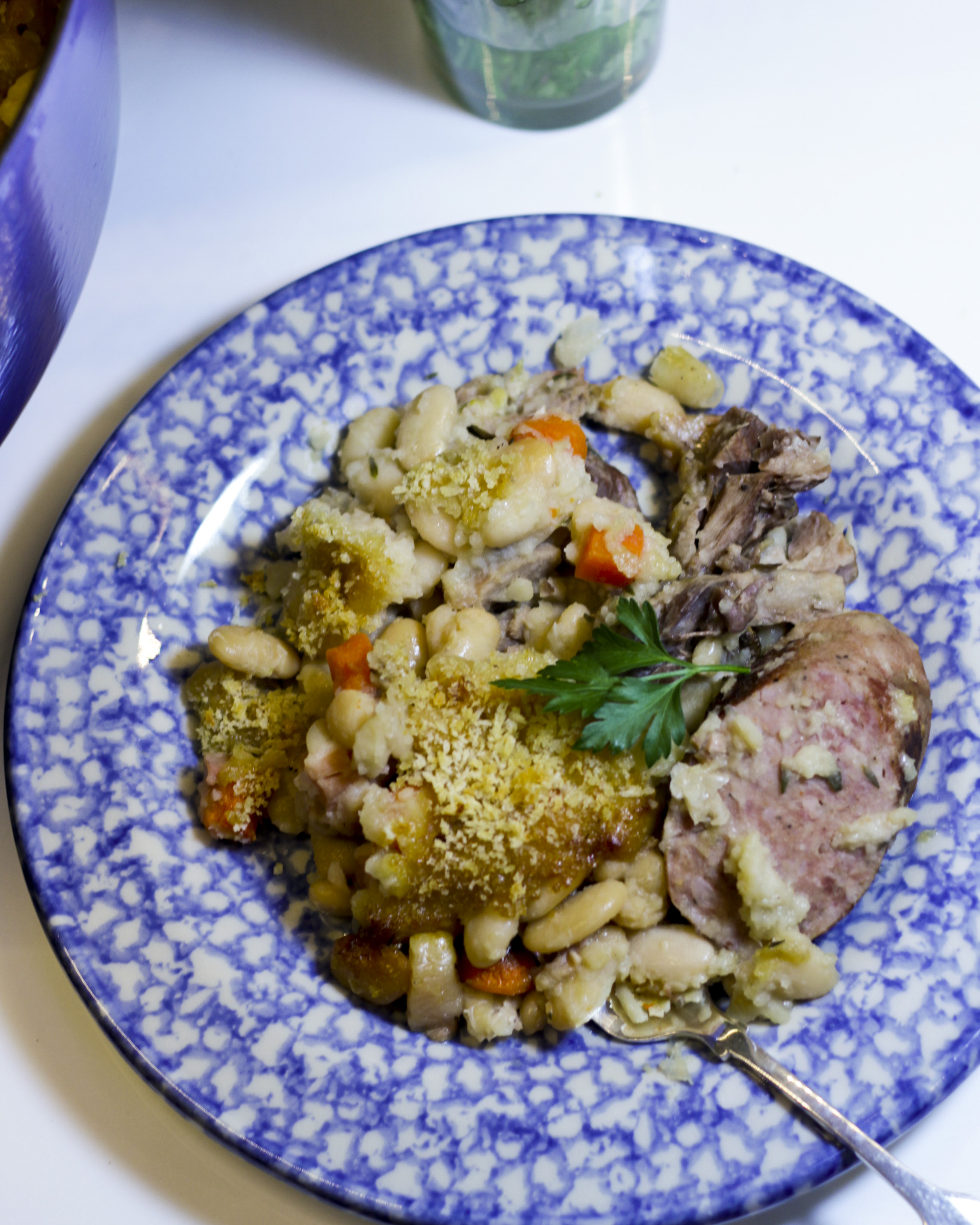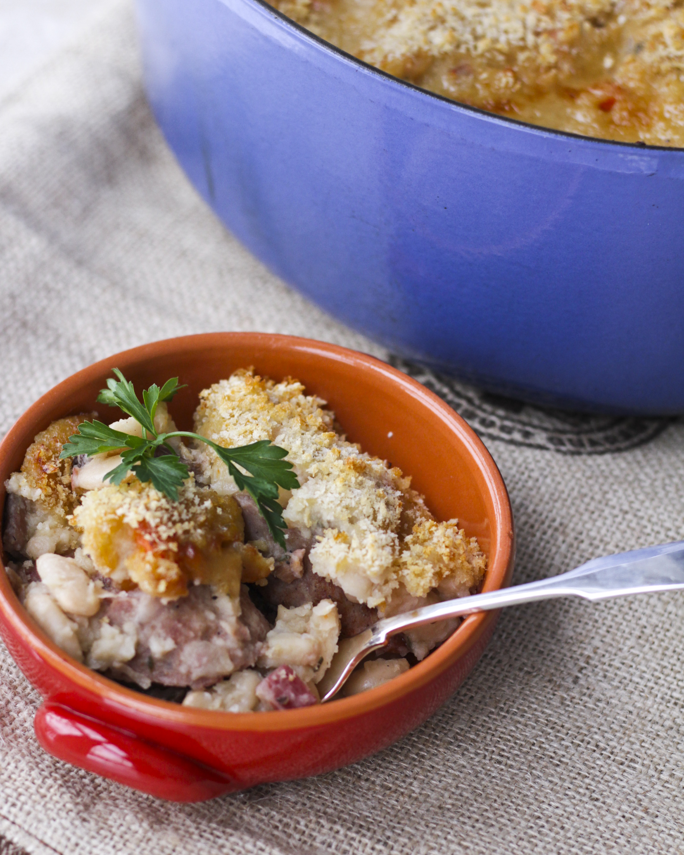 - Toss the bread crumbs (I used panko) with the oil until throughly moistened. Spread the crumbs evenly over the top of the cassoulet. Bake for an hour. Lower the temperature to 250°F and bake for another 2 1/2 hours.