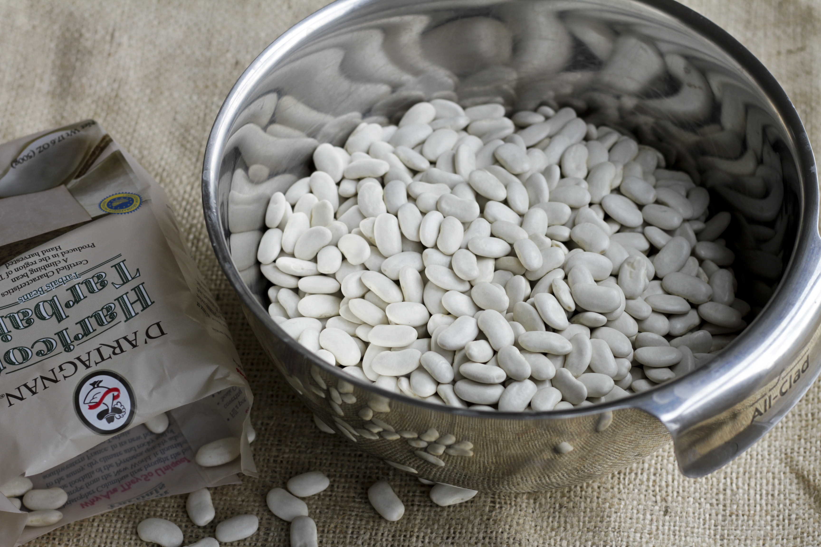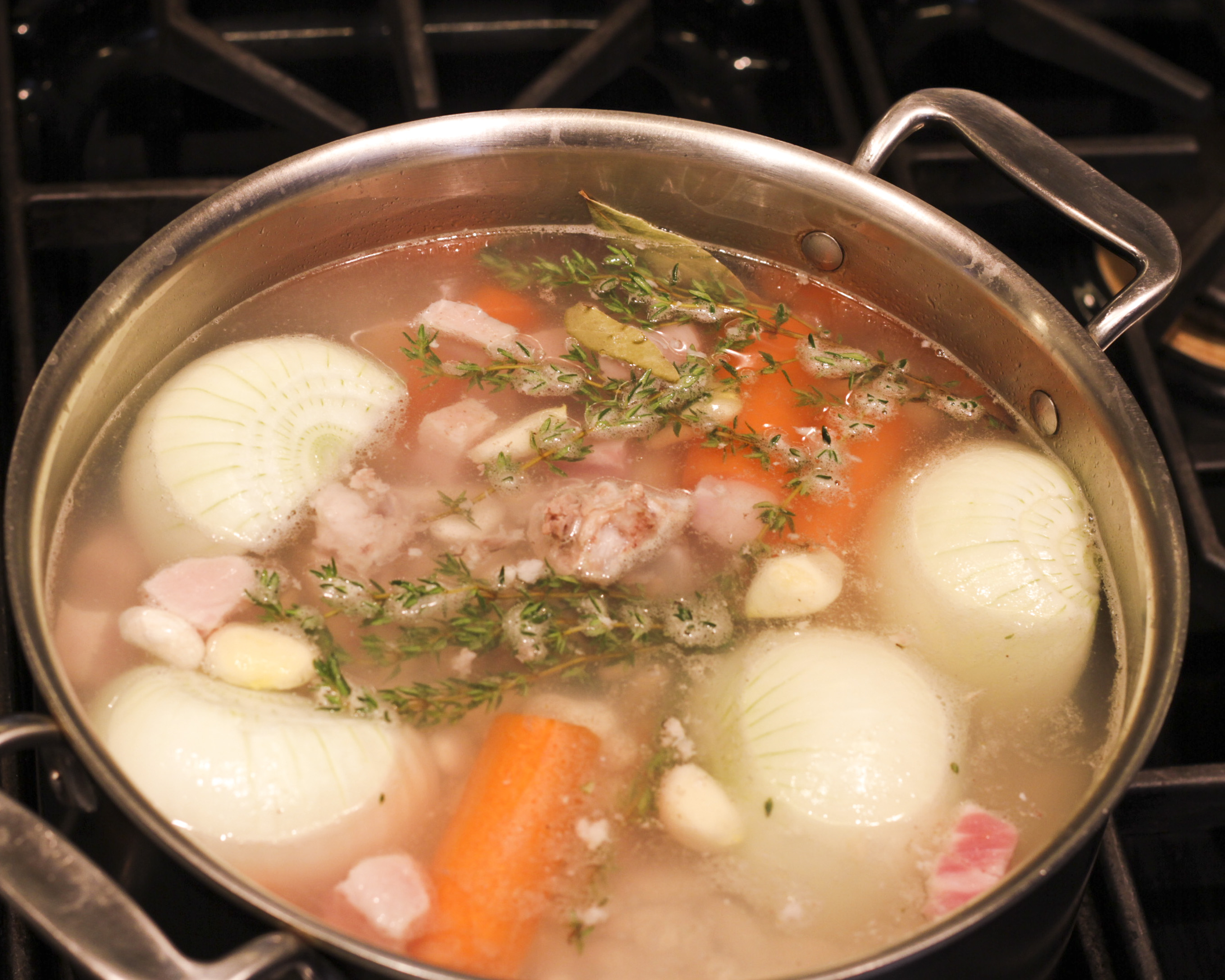 - Cook the beans in cold water along with the ham bones, pork belly (160 g) or pancetta, and bouquet garni (carrots, onions, garlic, bay leaves and thyme). Cook until the beans are barely tender, about 50 minutes.