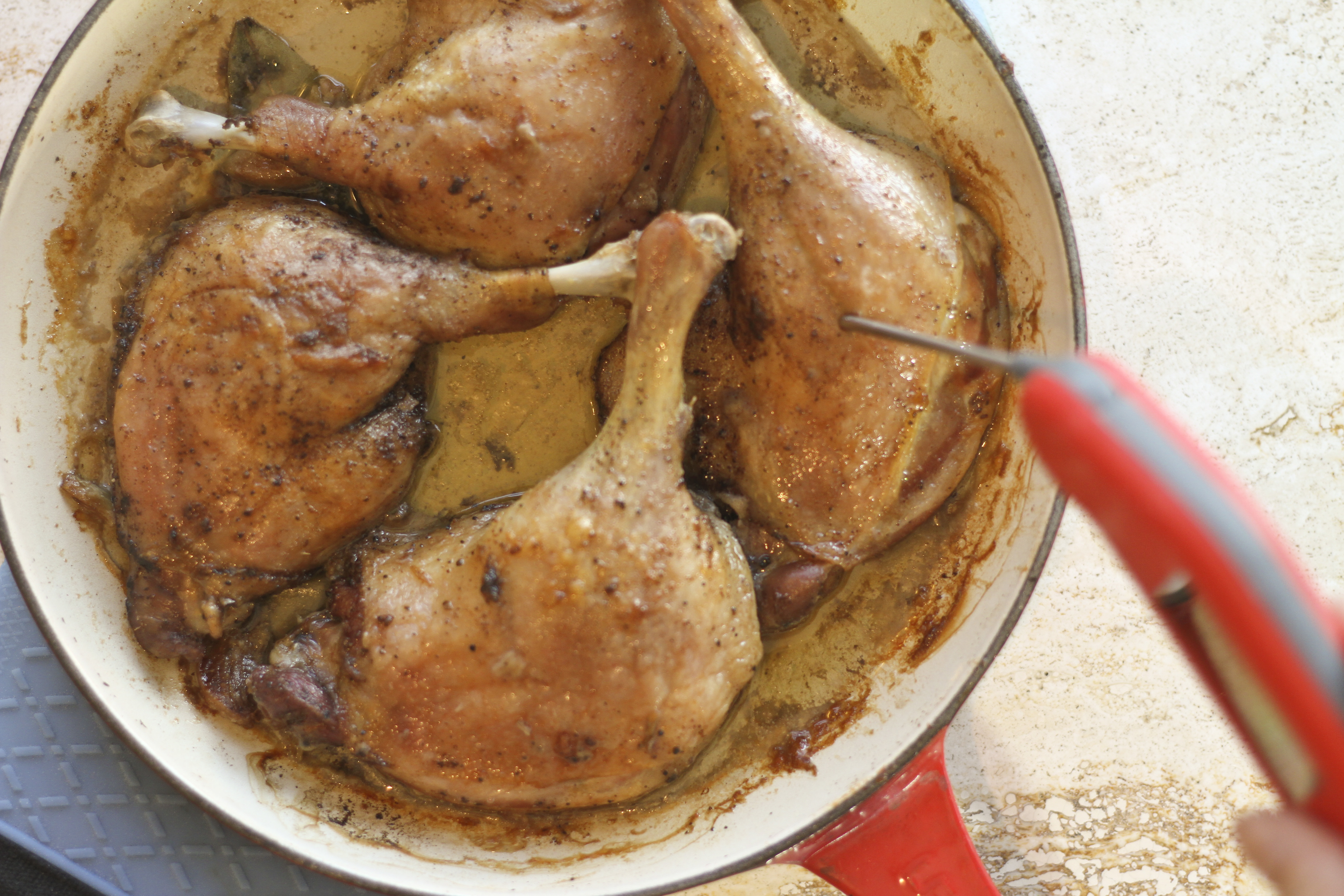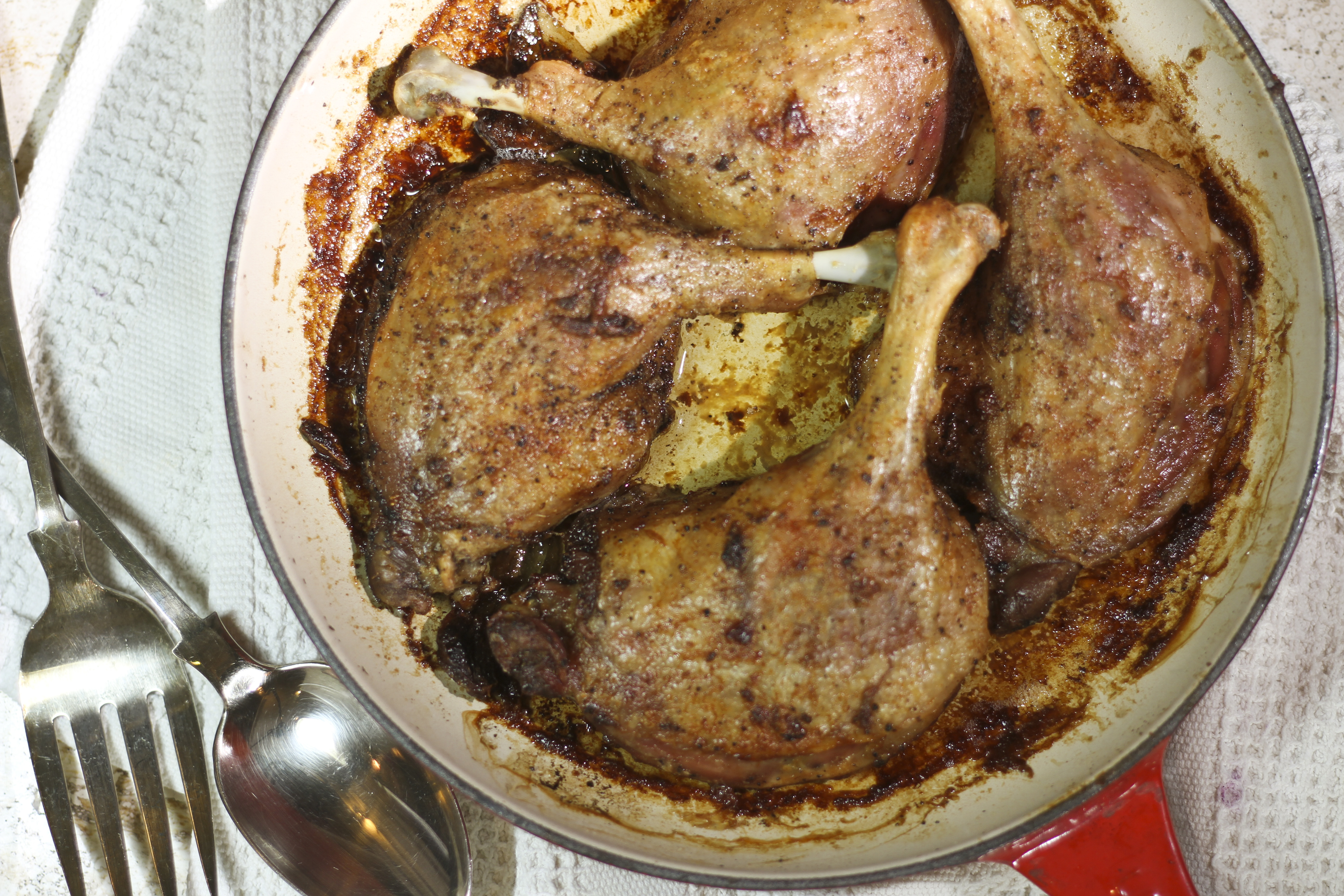 What you don’t expect is how short the ingredient list is. All you need, besides the duck thighs, are salt, gin, ground nutmeg, ground allspice, garlic and bay leaves. Combine the list of ingredients into a spice mixture and marinate the duck thighs overnight. The key is to tightly pack the duck legs in an ovenproof pan. Next, slow roast at low 300°F temperature oven for 2 1/2 hours. From time to time, bast the legs with the duck fat pooling in the pan. Finally, to get the skin crispy and browned, turn up the oven temperature to 375°F for an additional 15-20 minutes.