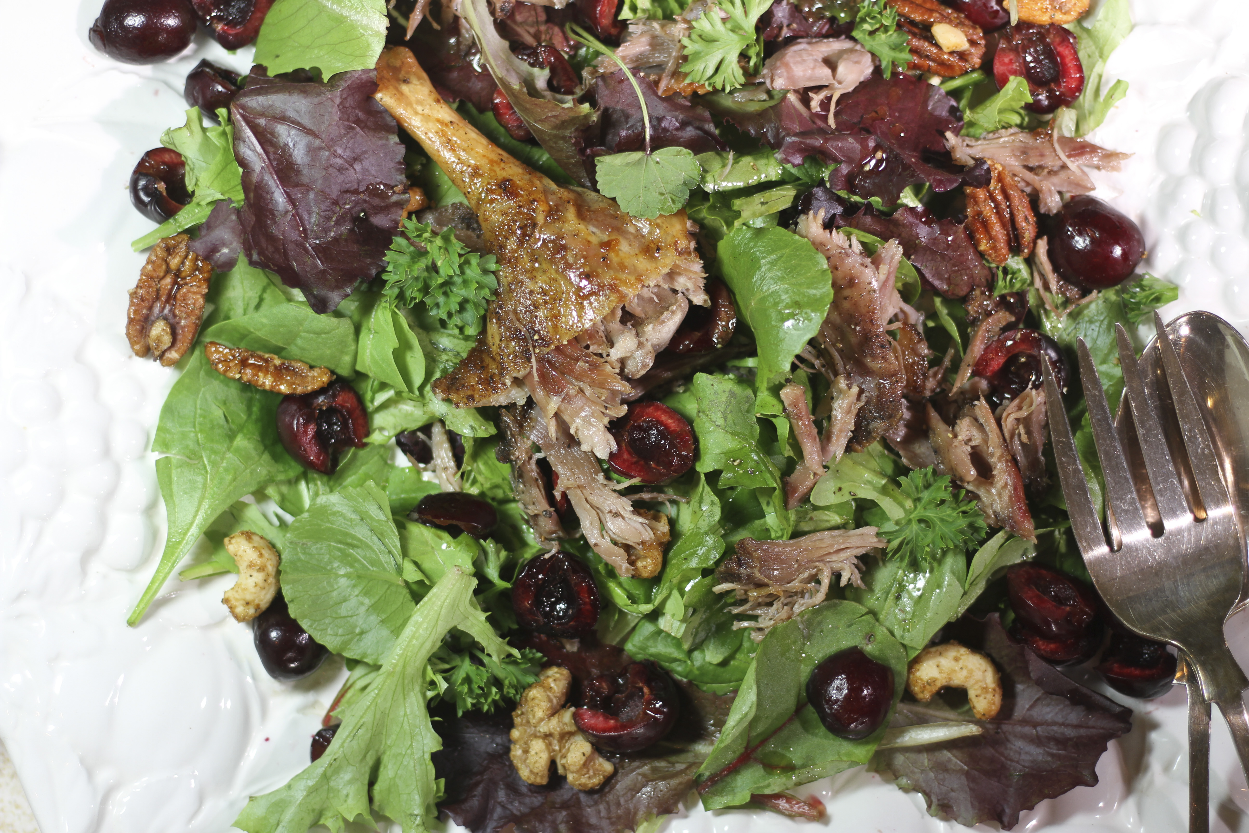 It is so simple to do, yet the results are so spectacular. (See whether our friends at Cook-the-Book Fridays agree with my take on this recipe or not.) Best of all, the texture of the duck confit is better than what I used to order. This recipe is a keeper for sure. I served the duck confit in a salad with fresh cherries, chipotle spiced mixed nuts and a simple vinaigrette dressing. When I turned around, the salad and all the duck confit were gone. Next time, I’ll cook a bigger batch. Freeze it so I’ll have duck confit, counterfeit or not, ready to go when the mood strikes.
