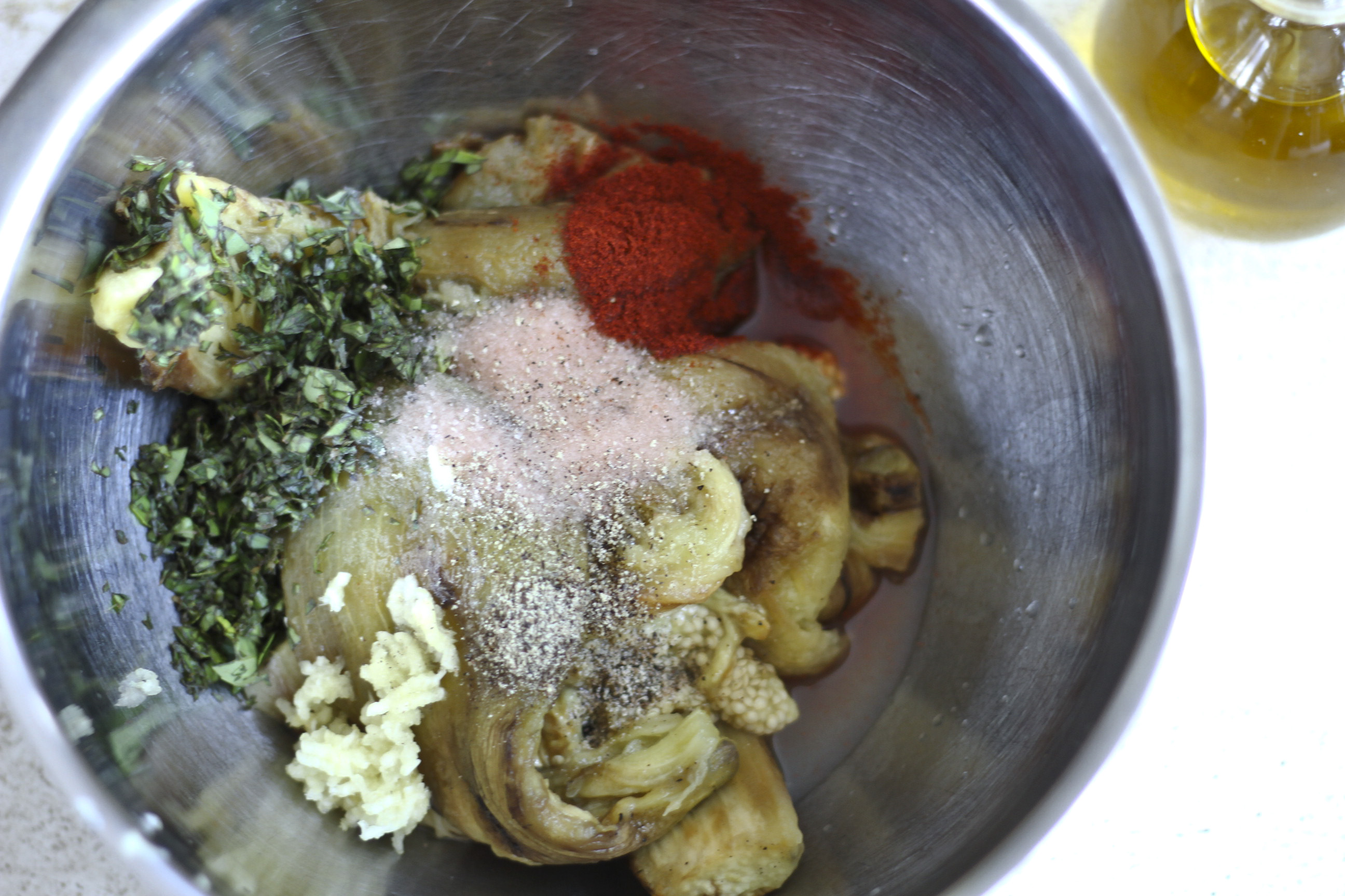 Eggplant is a subtle vegetable that can work with strong herbs. I picked some basil from the garden. Herbs like rosemary or marjoram could stand up well against the eggplant for an aromatic dip. Furthermore, eggplant can take on even richer, meatier flavor when it’s enhanced with miso or tahini. There are a lot of possibilities cooking with eggplant. Probably, this is a starting point from which to take off in endless directions. I’m already planning for the next dish!