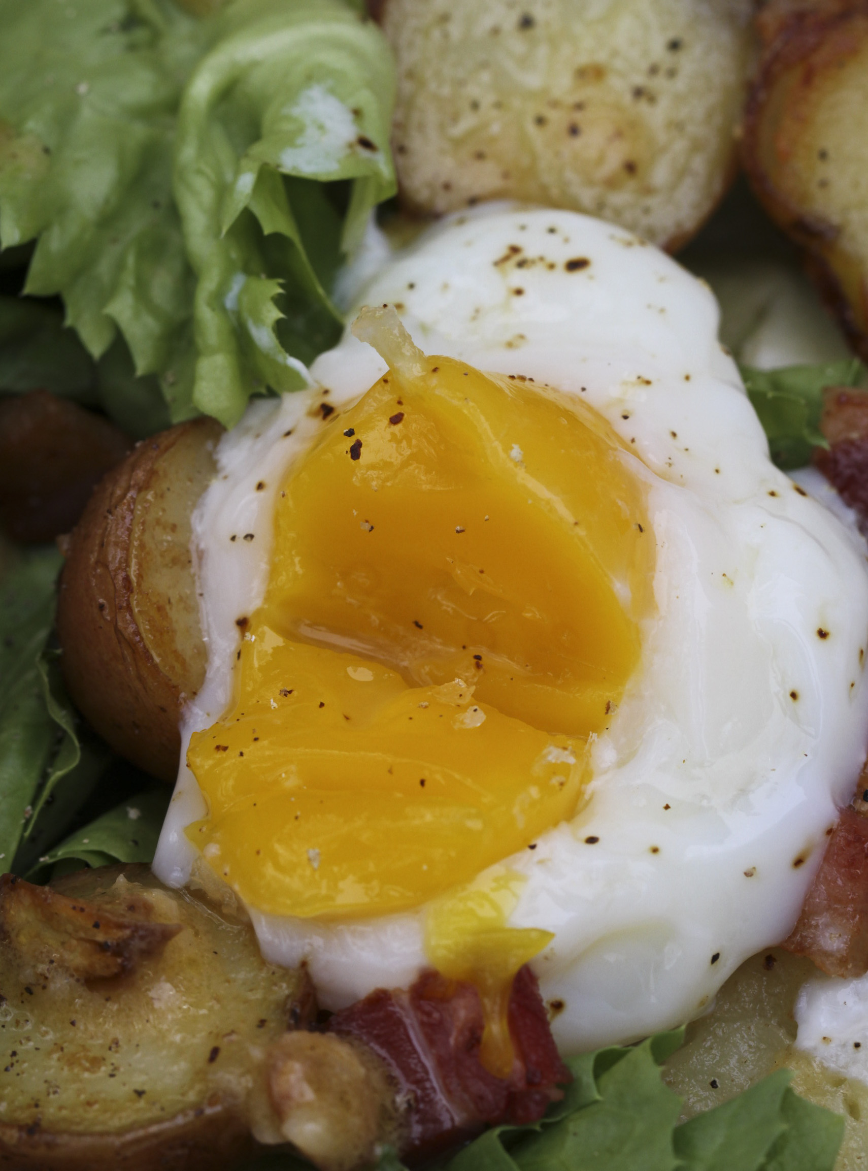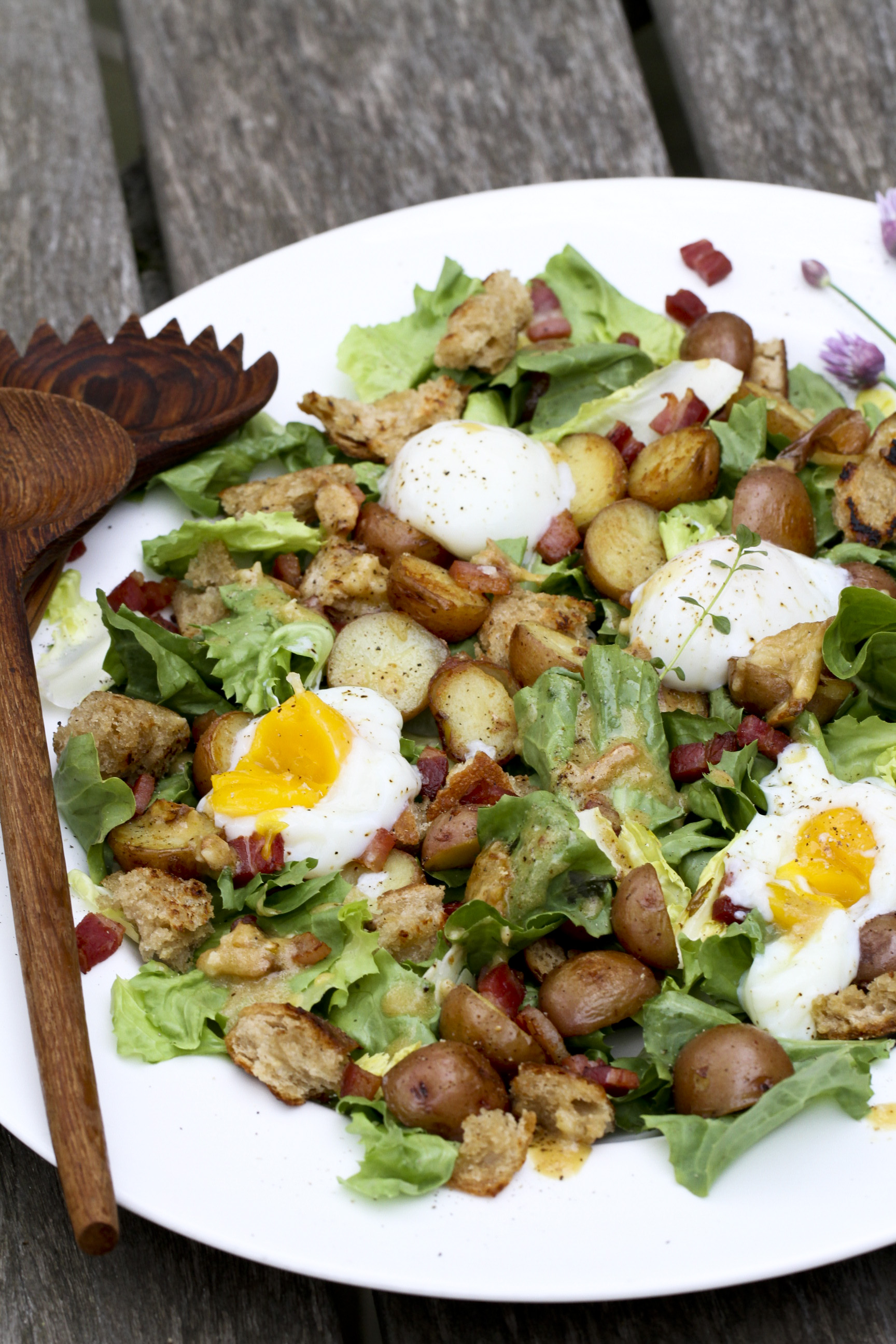 Salade Lyonnaise is universally beloved across France, but not in America. You would think any breakfast-like dishes that answer the early morning cravings for salty fatty bacon, creamy eggs, starchy potatoes and toasty bread will be an instant hit anywhere. Think again. I guess you have to hide the vegetables. Call it bacon, egg and potatoes on a bed of greens. That would certainly widen the appeal of this wonderful hearty dish. Just don’t call it a salad.