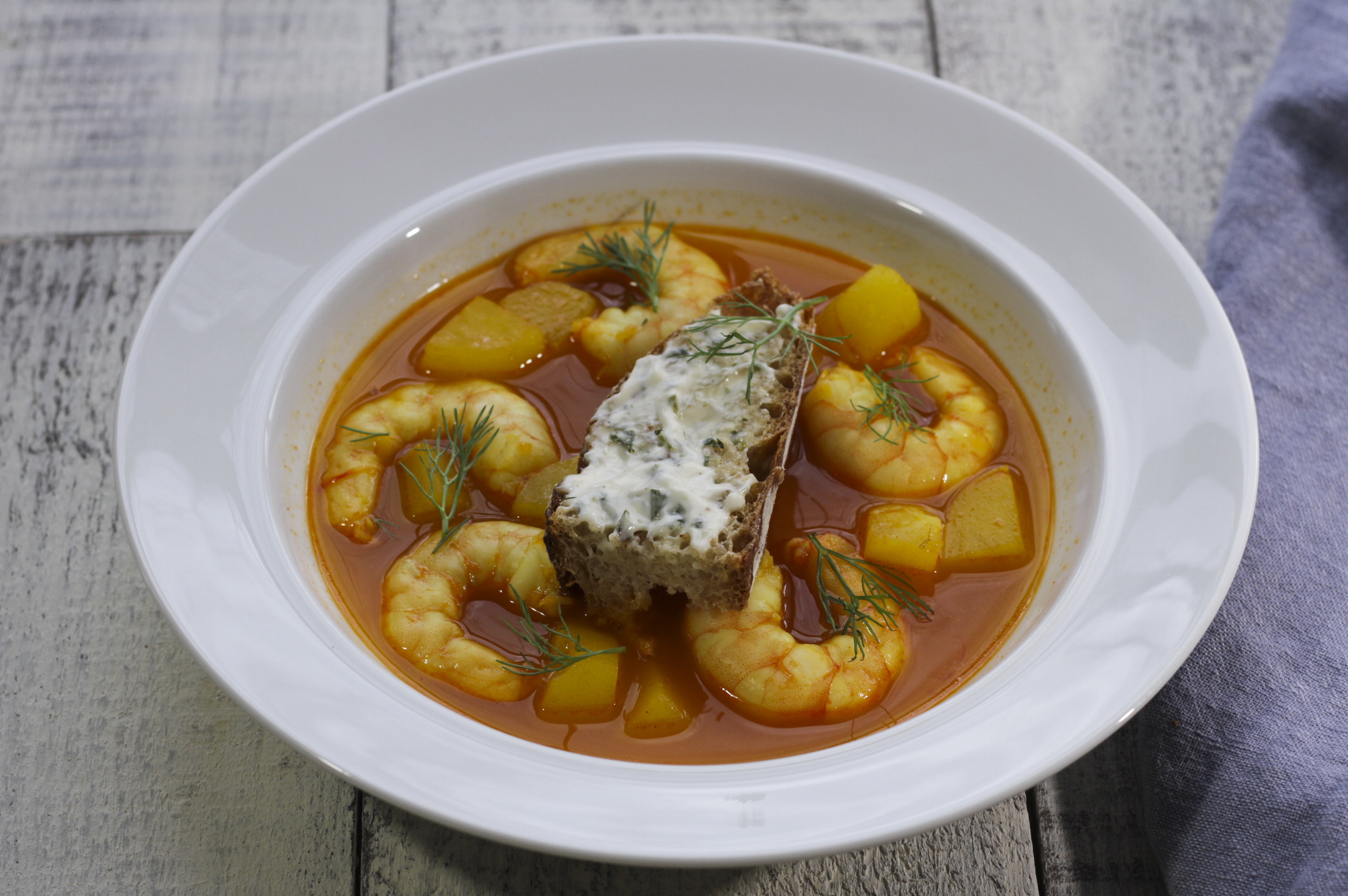 Julia Child, who lived in Marseille for a year, wrote this in My Life in France. “To me the telling flavor of bouillabaisse comes from two things: the Provençal soup base — garlic, onions, tomatoes, olive oil, fennel, saffron, thyme, bay, and usually a bit of dried orange peel — and, of course, the fish — lean (non-oily), firm-fleshed, soft-fleshed, gelatinous, and shellfish.” I wonder what she’d had thought about a gochujang – Korean style shrimp bouillabaisse.
