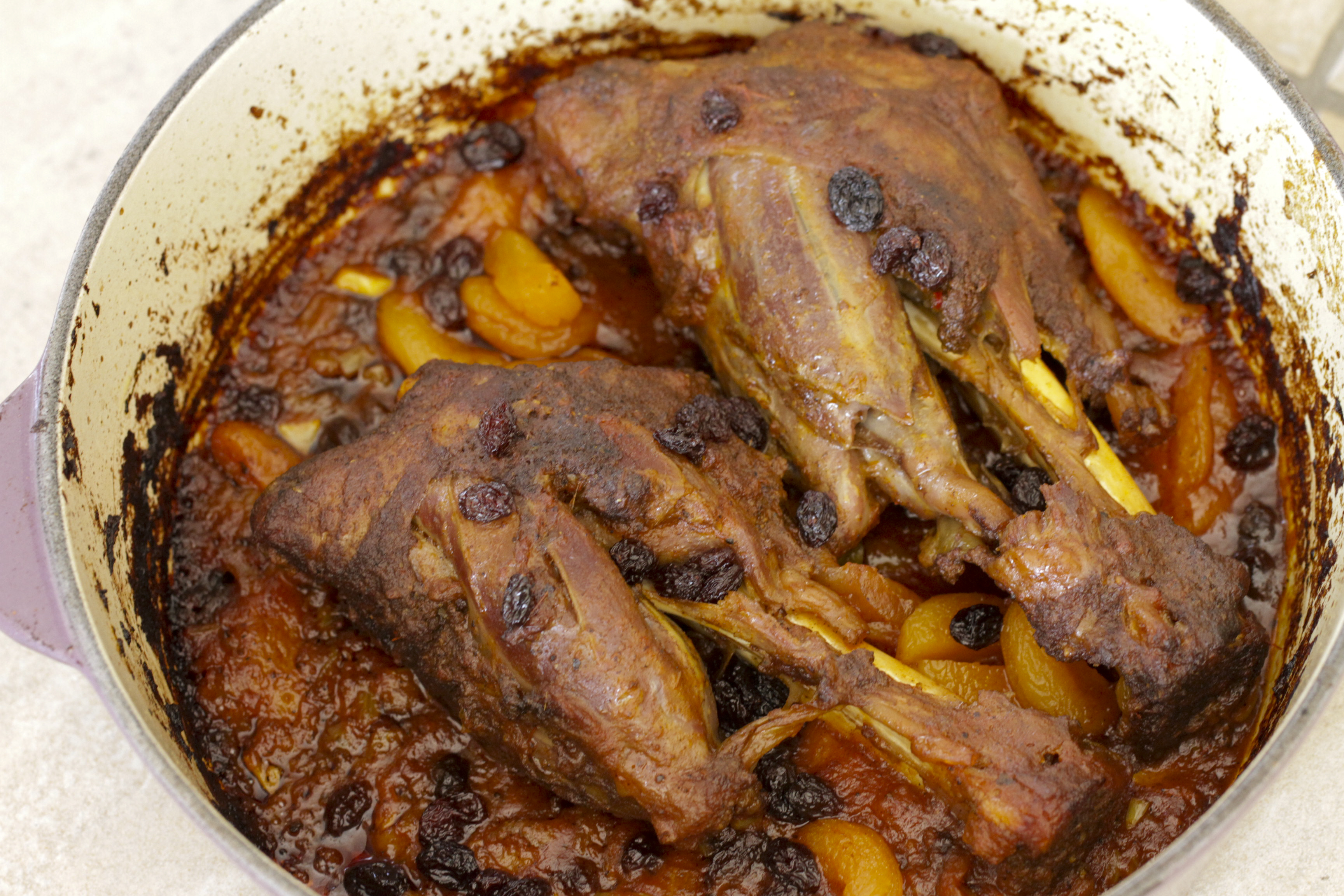 Tagine is the clay cooking pot, as well as a serving vessel, with a conical lid that gives its name to a myriad of dishes. The conical shape makes a uniquely moist, hot cooking environment ideal for stews and roasts. I wish I have one of those pots. Anyhow, the cast iron Dutch oven has to do double duty for the searing and slow roasting the lamb shanks in the oven. It took me about a total of two hours to cook two lamb shanks. I added part of the apricots and raisins midway through. The Dutch oven was bubbling away. It did not take long for the liquid to start thickening. There was hardly the need to uncover the lid to finish the sauce. Should I have added more stock then and cooked the lamb a while longer?