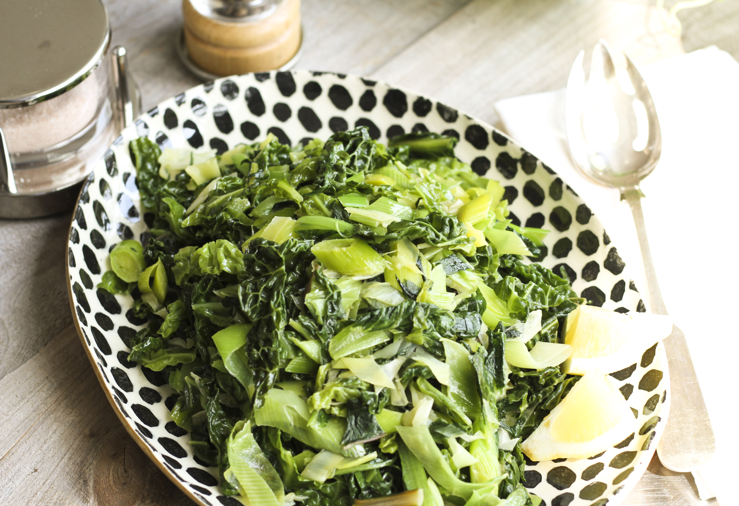 The beauty of this recipe is the fact that there is not really a recipe to follow. No timer or a temperature gauge is required. Just follow your nose or taste buds. Taste the leeks until wilted and slightly transparent. Steam the greens until they are tender to the bite. The key is to keep the cooking time short and sweet.