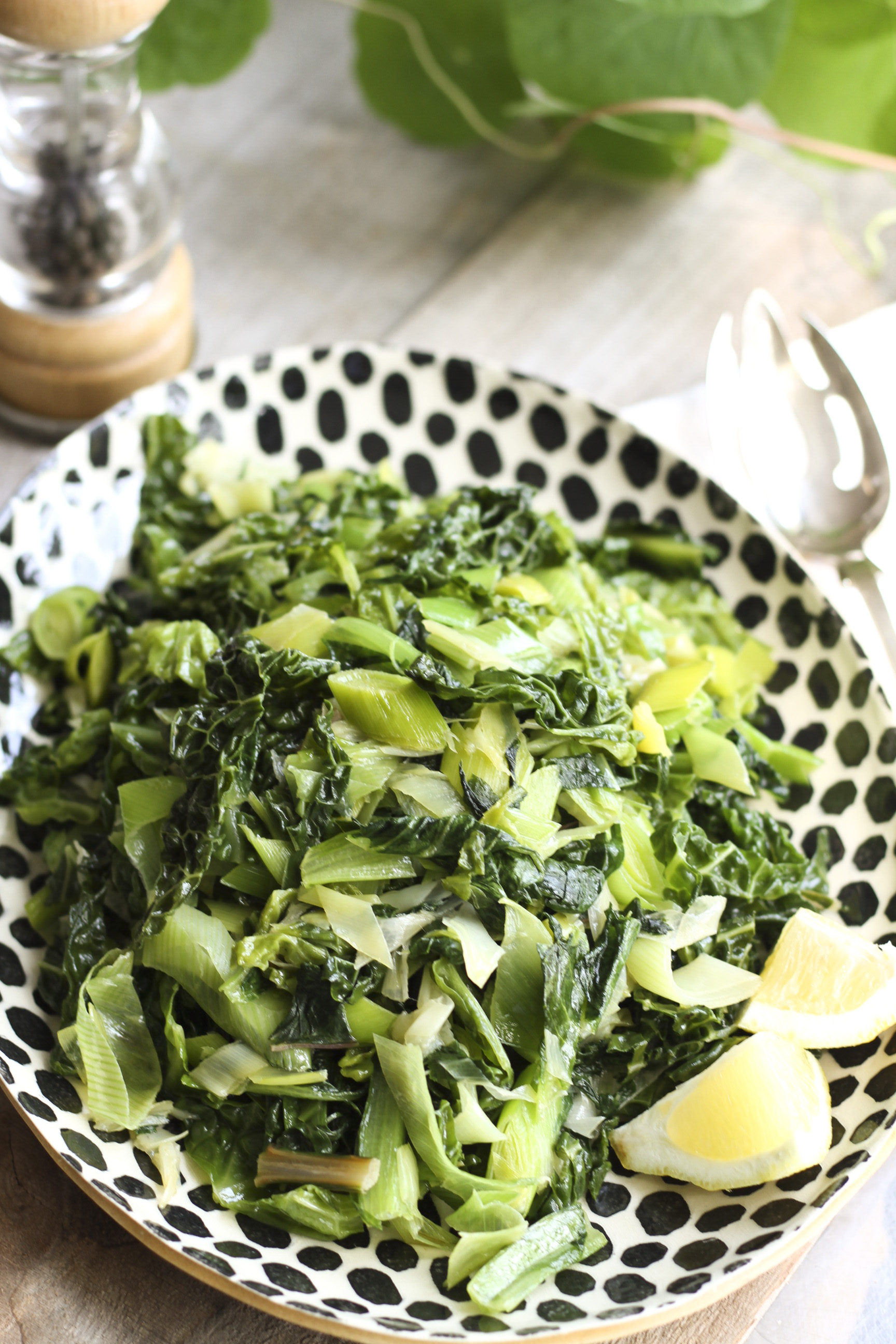 There are so few ingredients in this salad that seems to challenge the busy hands to pile things on top. There is not even the usual tomatoes or a vinaigrette, the constant companions to a green salad. The leeks, which are cooked in one tablespoon of butter until tender, bring the lovely sweetness to the braised greens. I used a head of savoy cabbage with some mixed greens from the garden: kale, chard and romaine. I want to harvest whatever is freshly available at the moment.