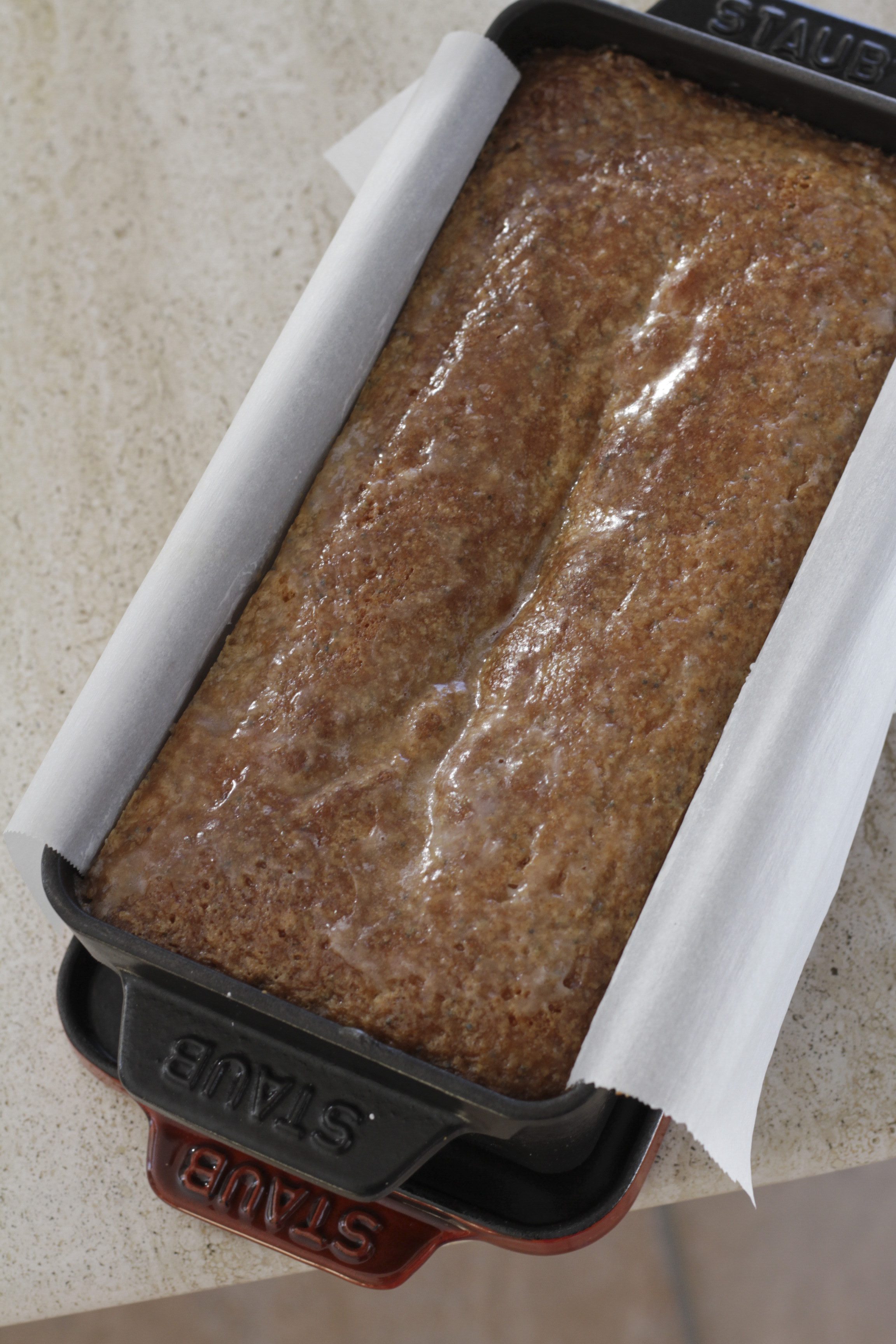 Pour the glaze over the top of the cake as soon as it comes out of the oven, spreading it over the top so that it sinks in and creates a nice coating. Set aside to cool for 30 minutes before removing from the pan. Leave to come to room temperature before serving.