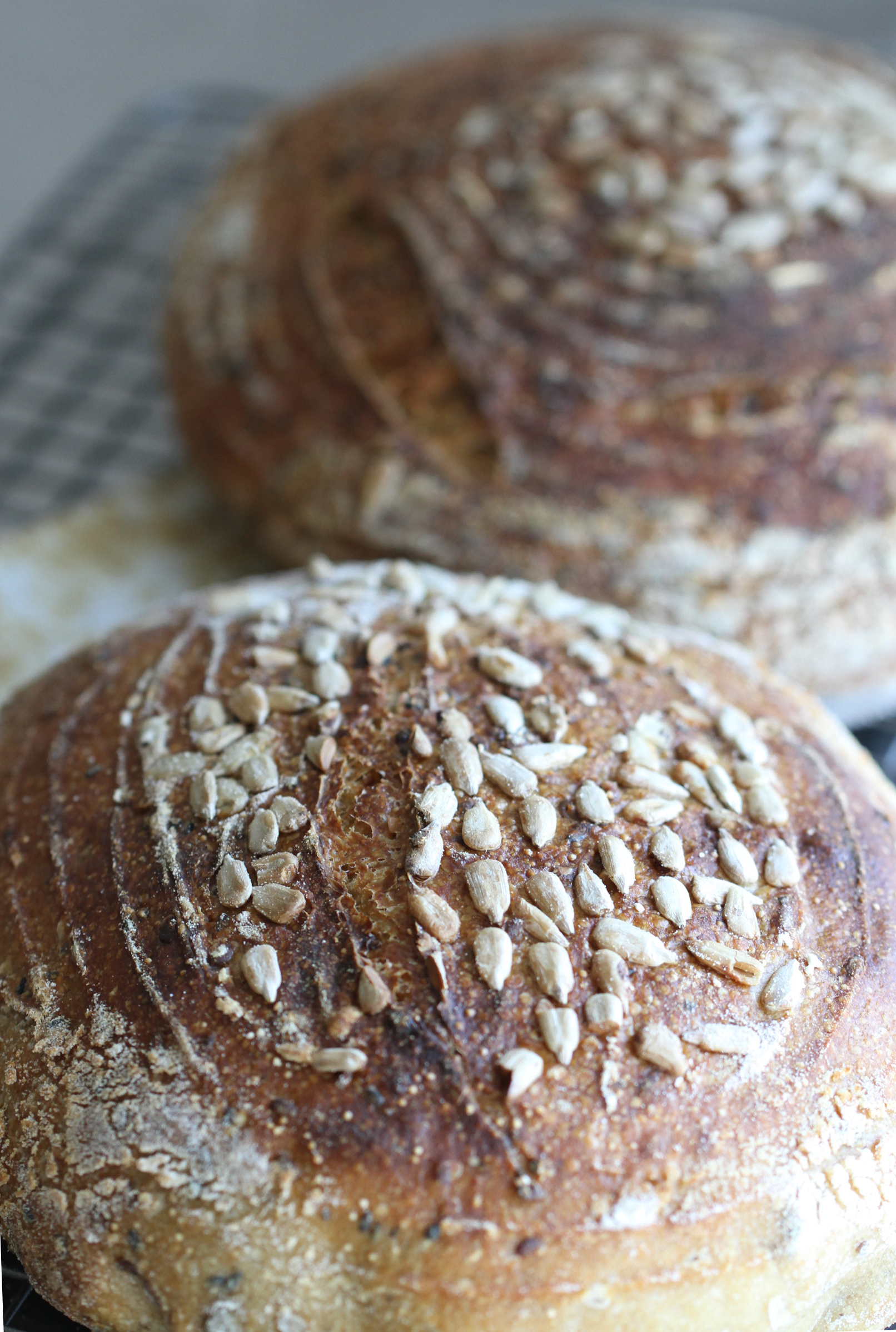 This sourdough bread is made with four grains: white bread flour (70%), sprouted wheat and sprouted spelt (for a combined 30%) and amaranth. The seeds are flaxseeds, pumpkin, sunflower and black sesame seeds (making up about 18% of total flour weight).