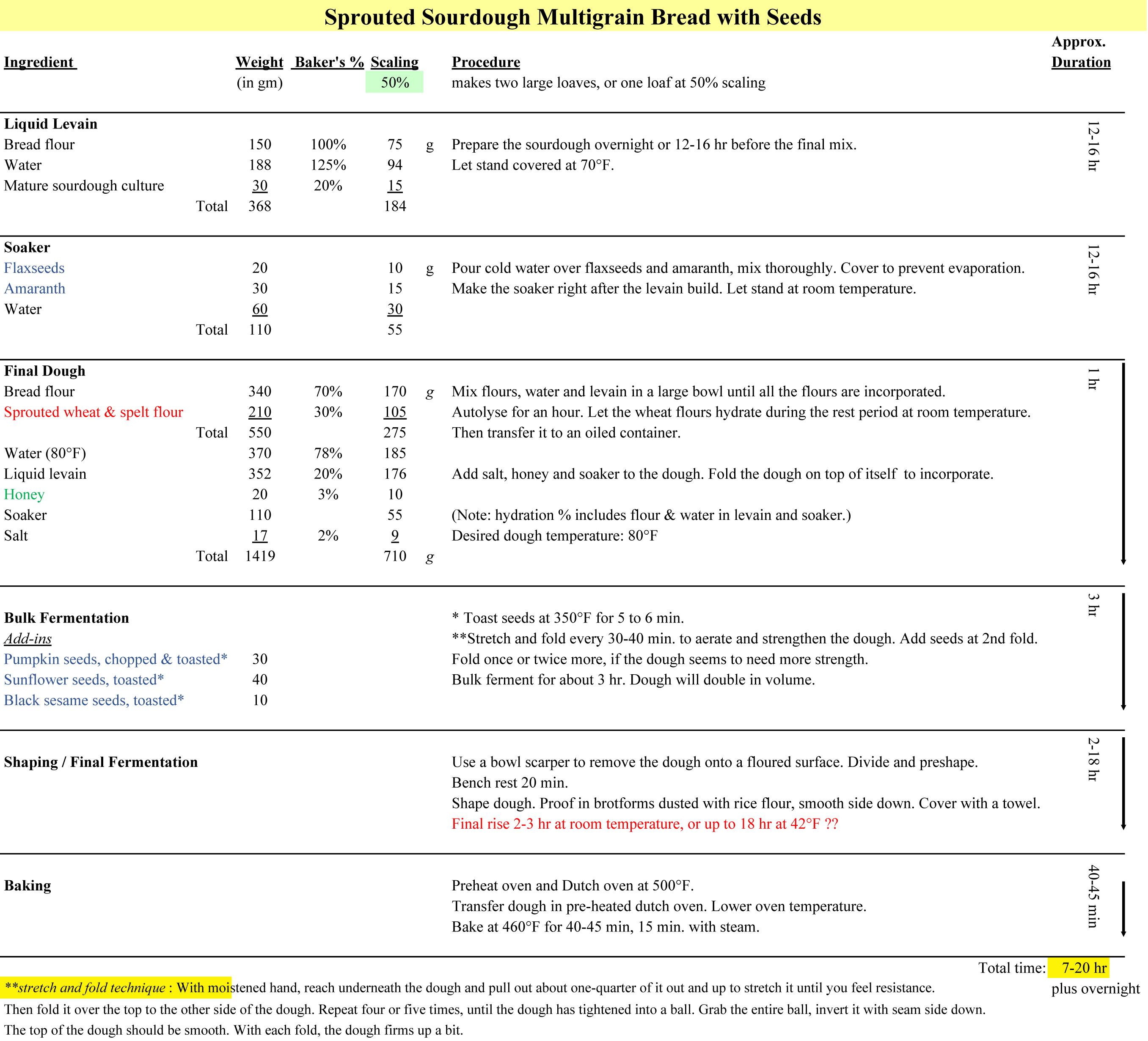 With over 30% of sprouted whole grains and 18% of seeds in the dough, you won’t expect an open crumb texture to the finished loaves, but they are. The sourdough levain contributes to a flavorful tang and excellent keeping quality of the bread. The flaxseeds and amaranth were soaked in cold water so that I can check the hydration at the time of mixing. (Although, in retrospect, I may not have been as careful as I should.) The flour, water and levain mix was autolysed for an hour since whole wheat flours would benefit from a longer resting period. See the cheat sheet below for details.