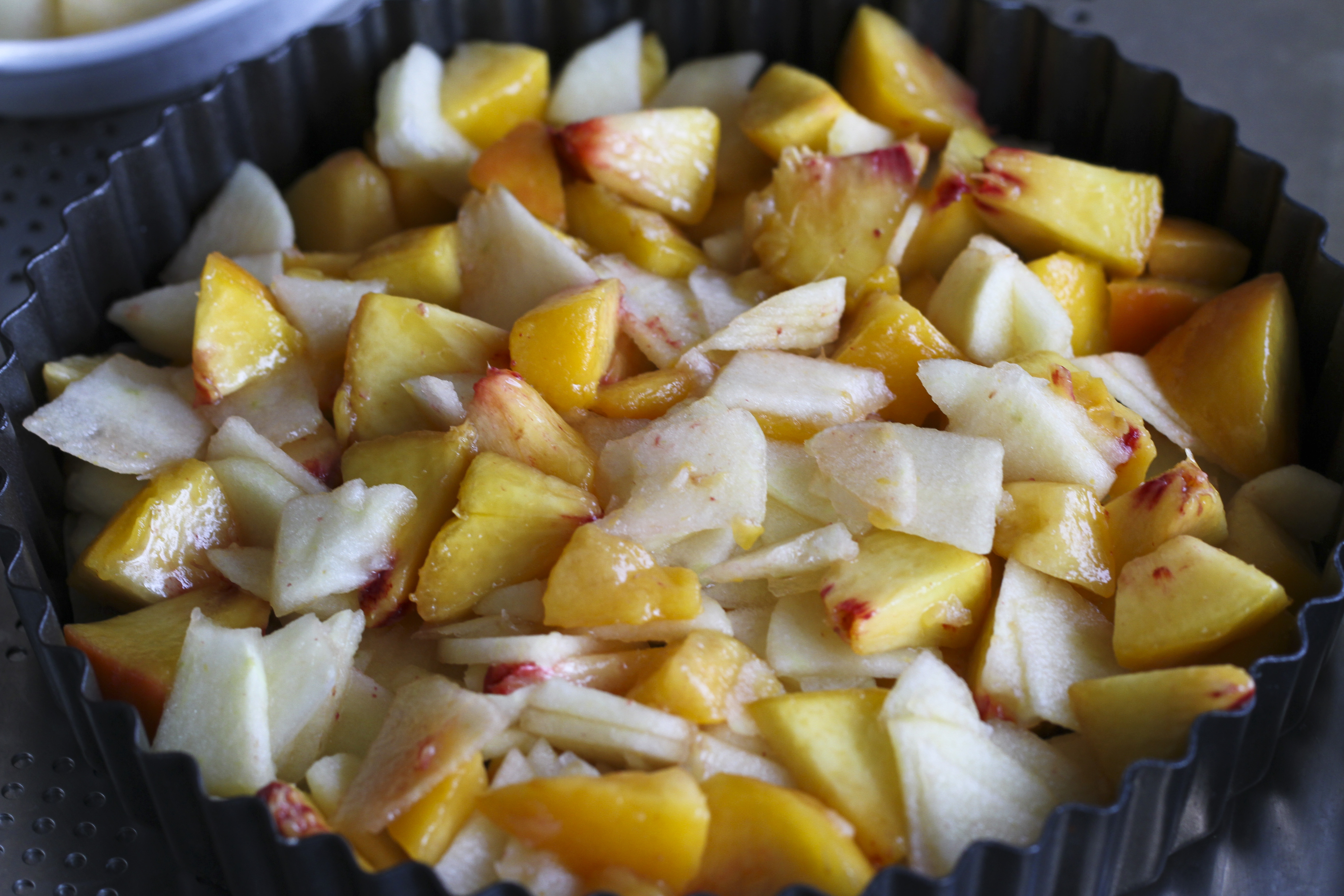 Using fresh ripe, but firm, peaches and sweet tasting apples is a must. (Less sugar to be added.) I used Honey Crisp apples for this dish.