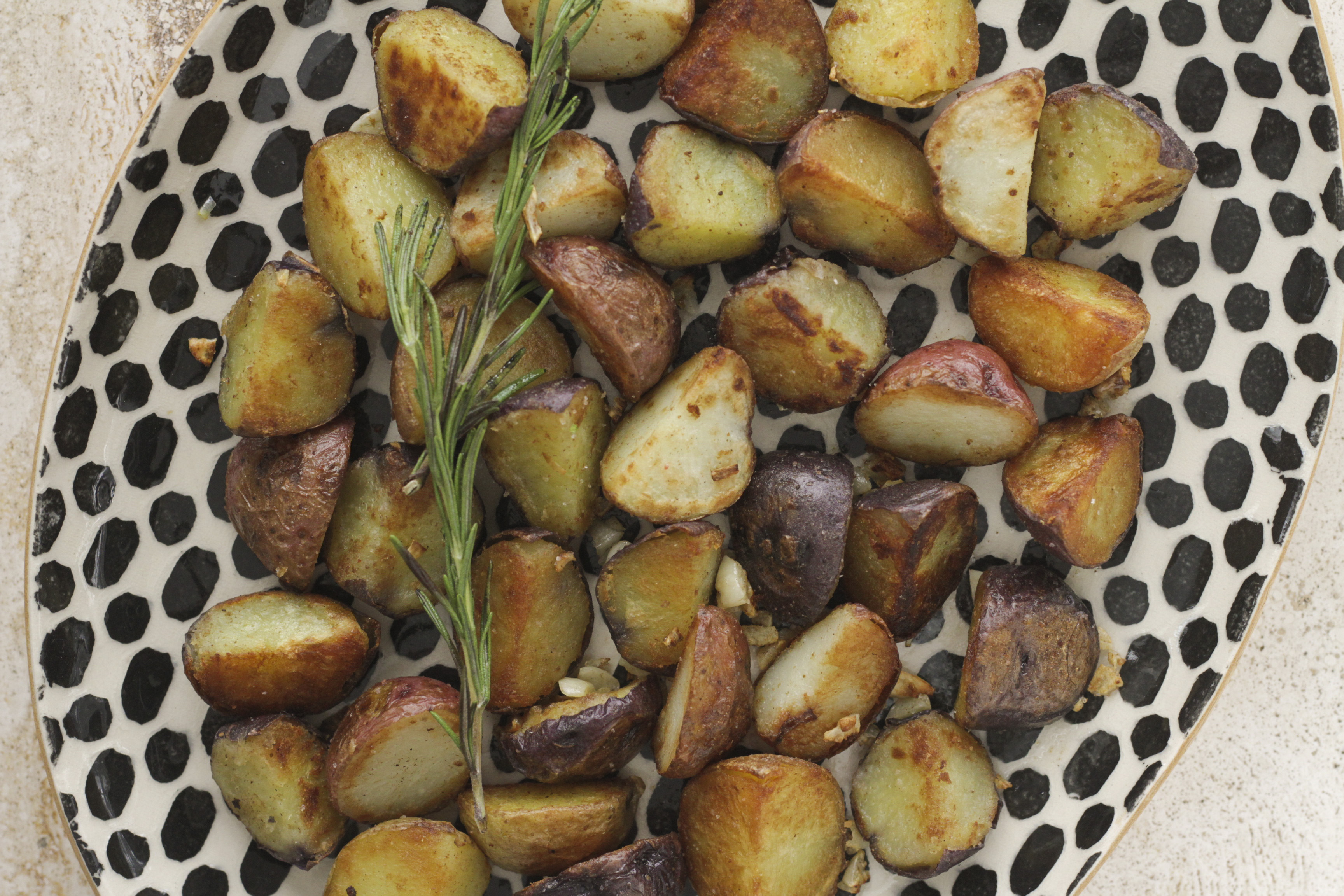 The peeled and more-or-less evenly cut russet potatoes look and taste more refined. They are skinless. However, the unpeeled and halved (or quartered) new potatoes have a more rustic appeal. When you are the cook, the new potatoes are more fun to do. No peeling and less cutting is involved. Also, they don’t stick to the pan the way russet potatoes do. They are easier to shake and roll in the pan. Finally, the new potatoes come in multiple colors of beige, red and purple.