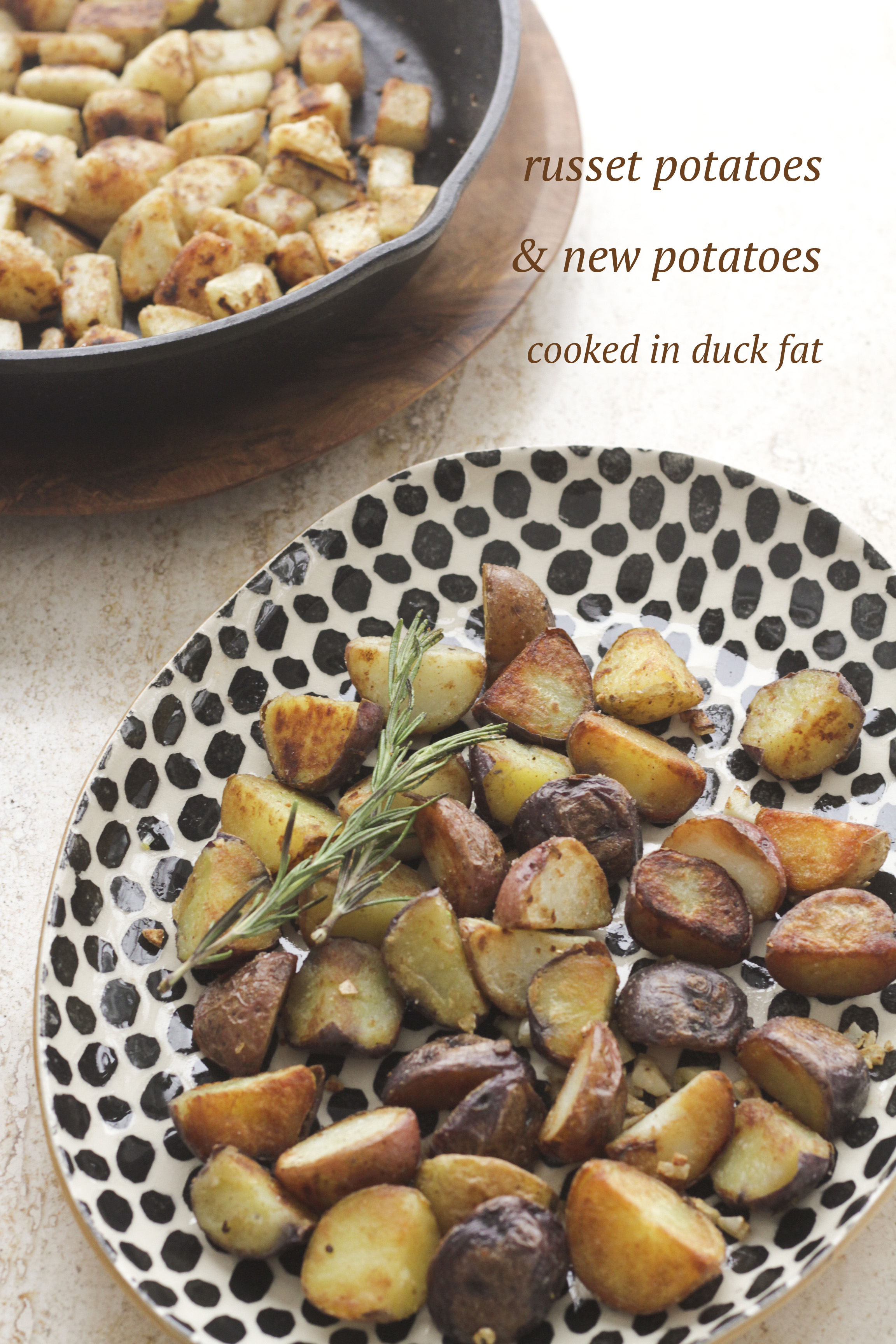 I used two kinds of potatoes and turned this recipe into a taste test. David suggests the russet potatoes, the kind of classic starchy potatoes which are generally good for the fryer. Since I fry potatoes infrequently, I keep mostly small new potatoes, the waxy kind, in the pantry for all-purpose cooking. Then I proceeded with sautéing both the russet and new potatoes in duck fat according to the recipe directions.