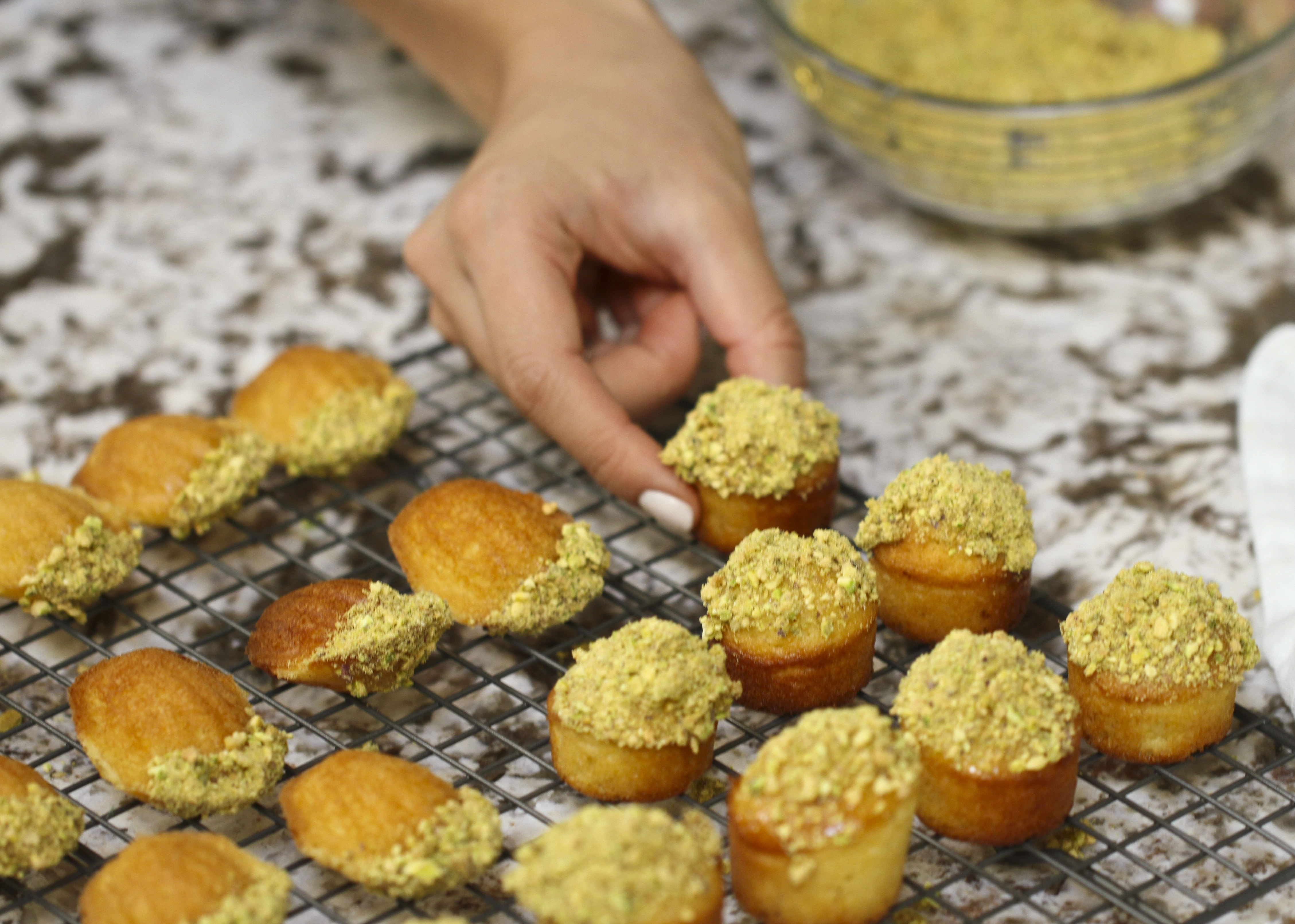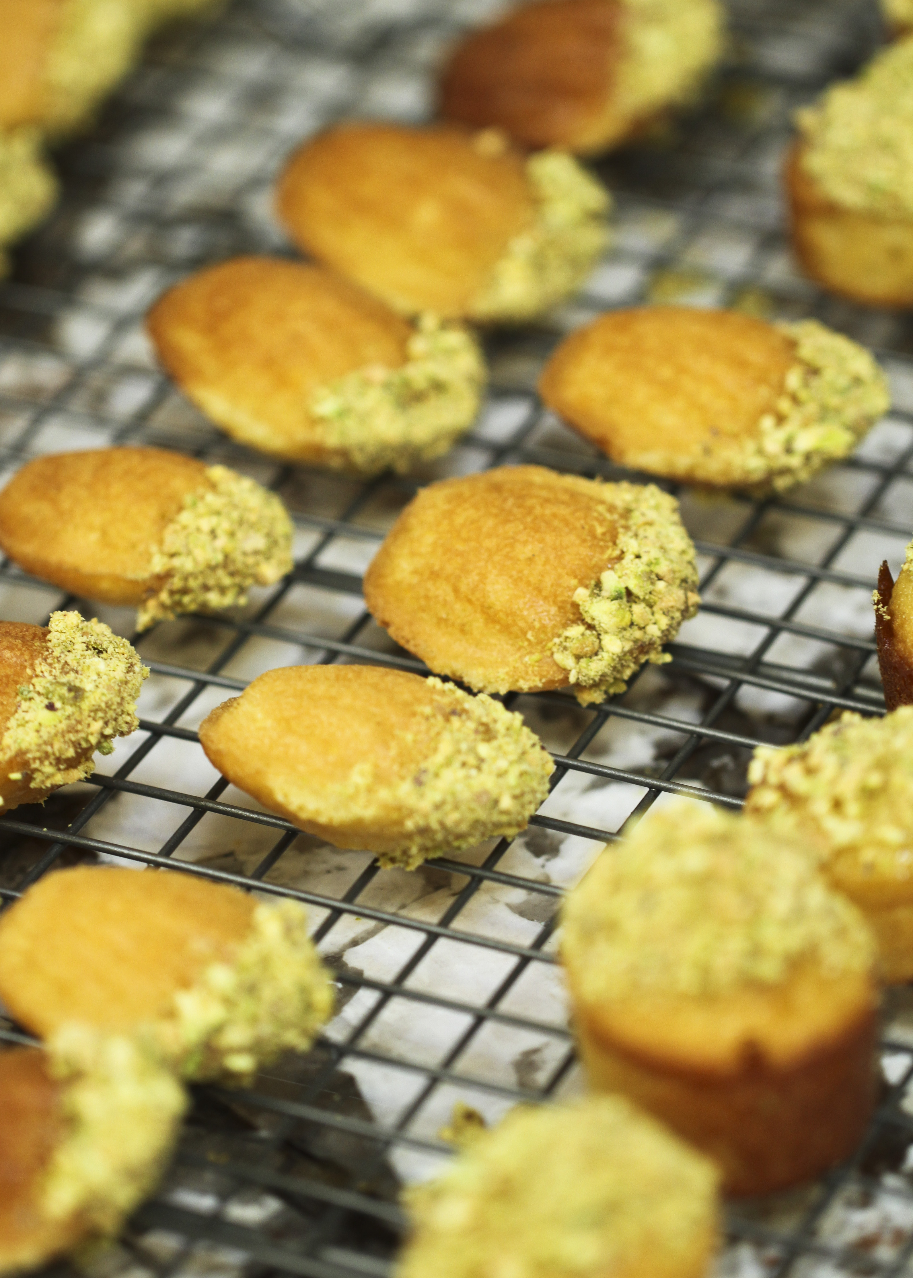 GLAZE THE MADELEINES: Pulse pistachios in food processor. Pile pistachios onto a plate in a straight line. Melt remaining 3 Tbsp. honey in a small saucepan or in a microwave until very runny. Brush lightly over shell-patterned side of one madeleine. With shell side facing down toward nuts, roll narrower end of madeleine along pile of pistachios so you have a straight ⅓" strip of pistachios at base of madeleine. Repeat with remaining madeleines. Transfer nut side up to a platter.