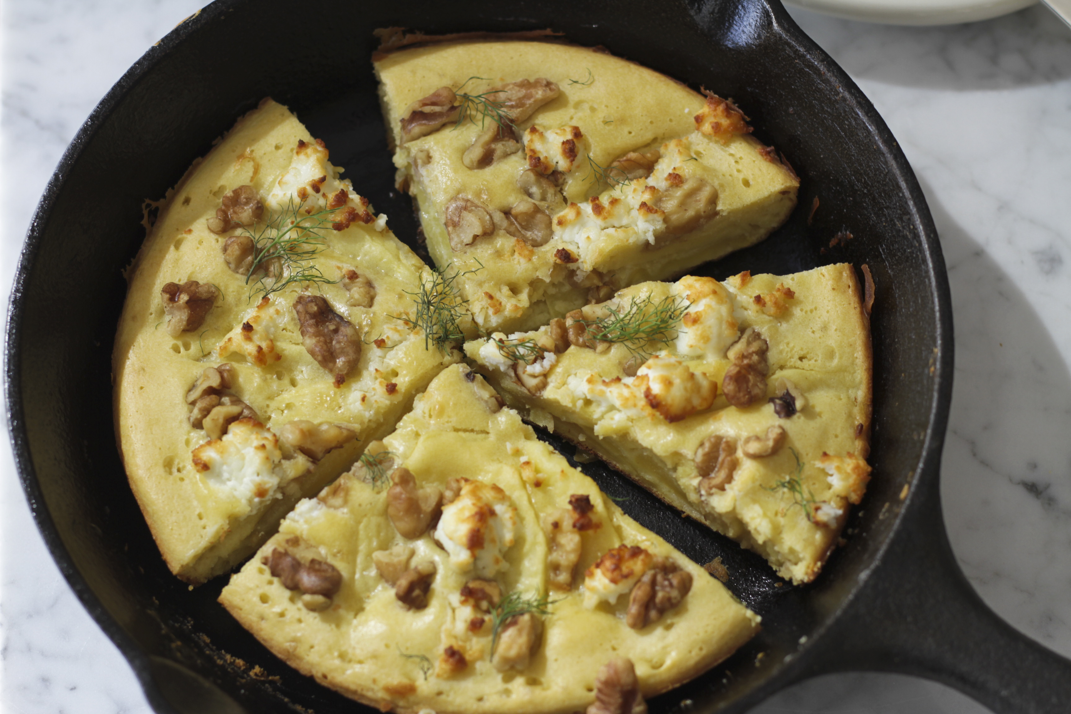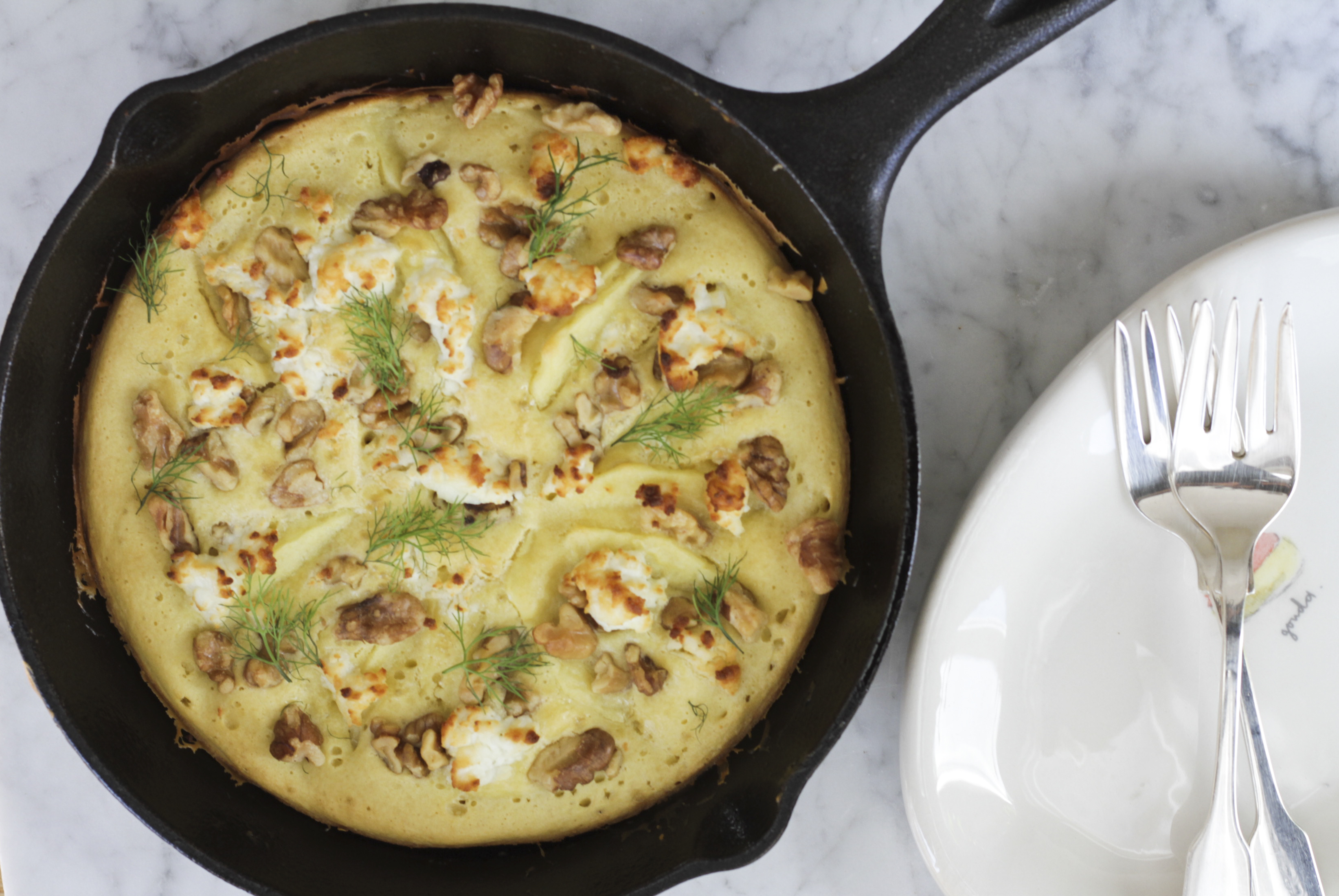 This is where my process differs from Dorie’s. Cook the matafan on the stovetop until the batter starts to set. Remove it from heat. Add the savory components. I chose chopped walnuts and goat cheese. Other vegetables and nuts like celery, fennel or pine nuts may also work well with apples. I sprinkled them sparingly over the top of the matafan. In retrospect, I should have covered the entire surface of the matafan like the way you do on a pizza pie. Flipping the cake is not necessary. The pan, topped with the savory additions, went into a preheated 350°F convection oven for about 15-20 minutes or until the goat cheese and walnuts took on some color.