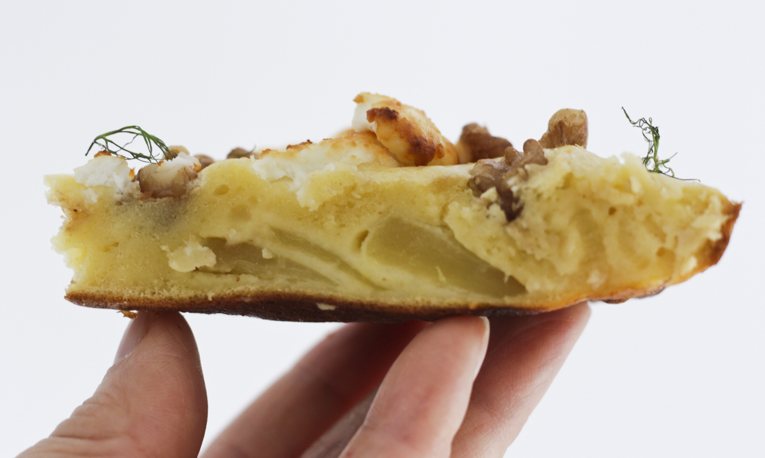 The savory apple matafan has all the sweet, savory and tangy notes from the apples and cheese. The walnuts provide a satisfying crunch to the cake. I am not missing the sugar. Substituting cheese and walnut for sugar for breakfast is always a winner in my book.