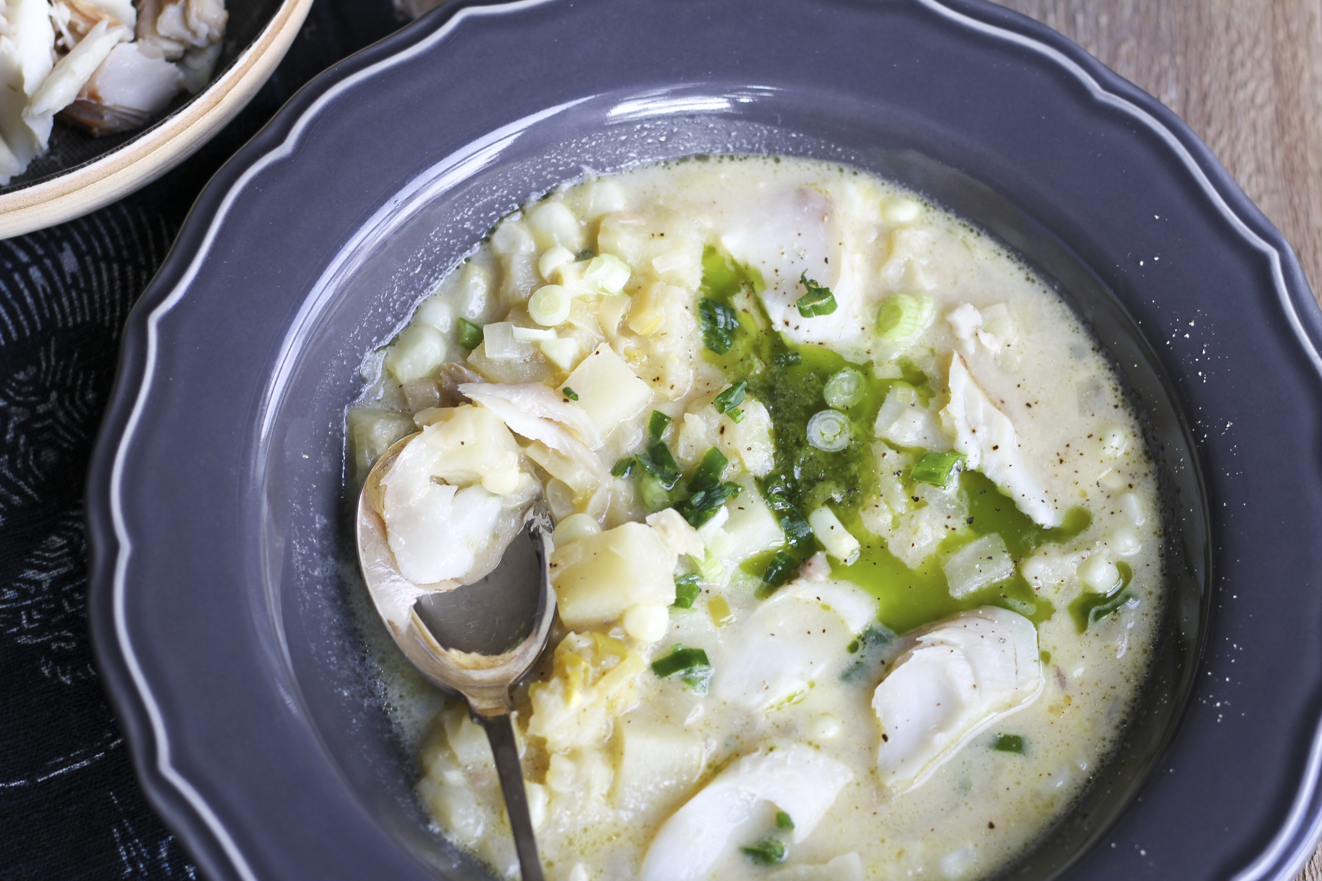 Make the chowder by sweating the onion and leek. Then add the fish stock and milk in equal proportions. Since the smoked fish is already cooked, it is just a matter of poaching it lightly and imparting the smoky flavor of the sea. Next, cook the potatoes in the liquid. Add the corn when the chowder is almost ready. I put the flaked fish fillet on the side instead of returning it to the hot chowder. To serve, sprinkle some scallions on top. Finally, it’s time to enjoy the smoked fish and corn chowder.