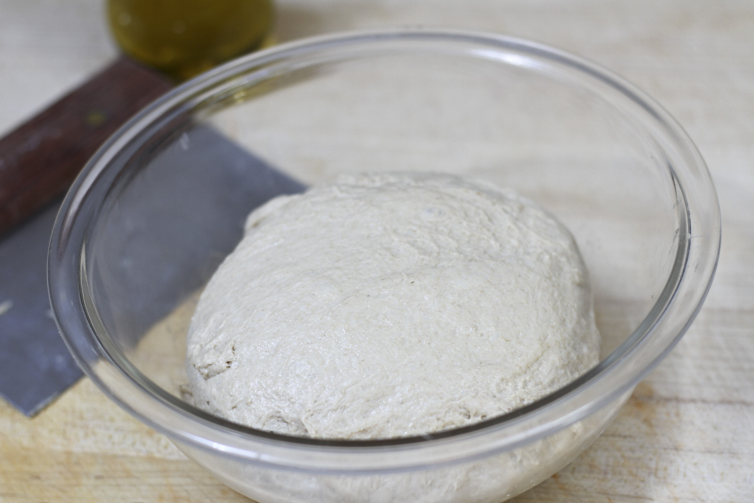 Transfer the dough to a well-greased work surface and stretch and fold it over onto itself once — a dough scraper works well for this. Cover the dough with a large bowl and let it rest for 5 minutes.