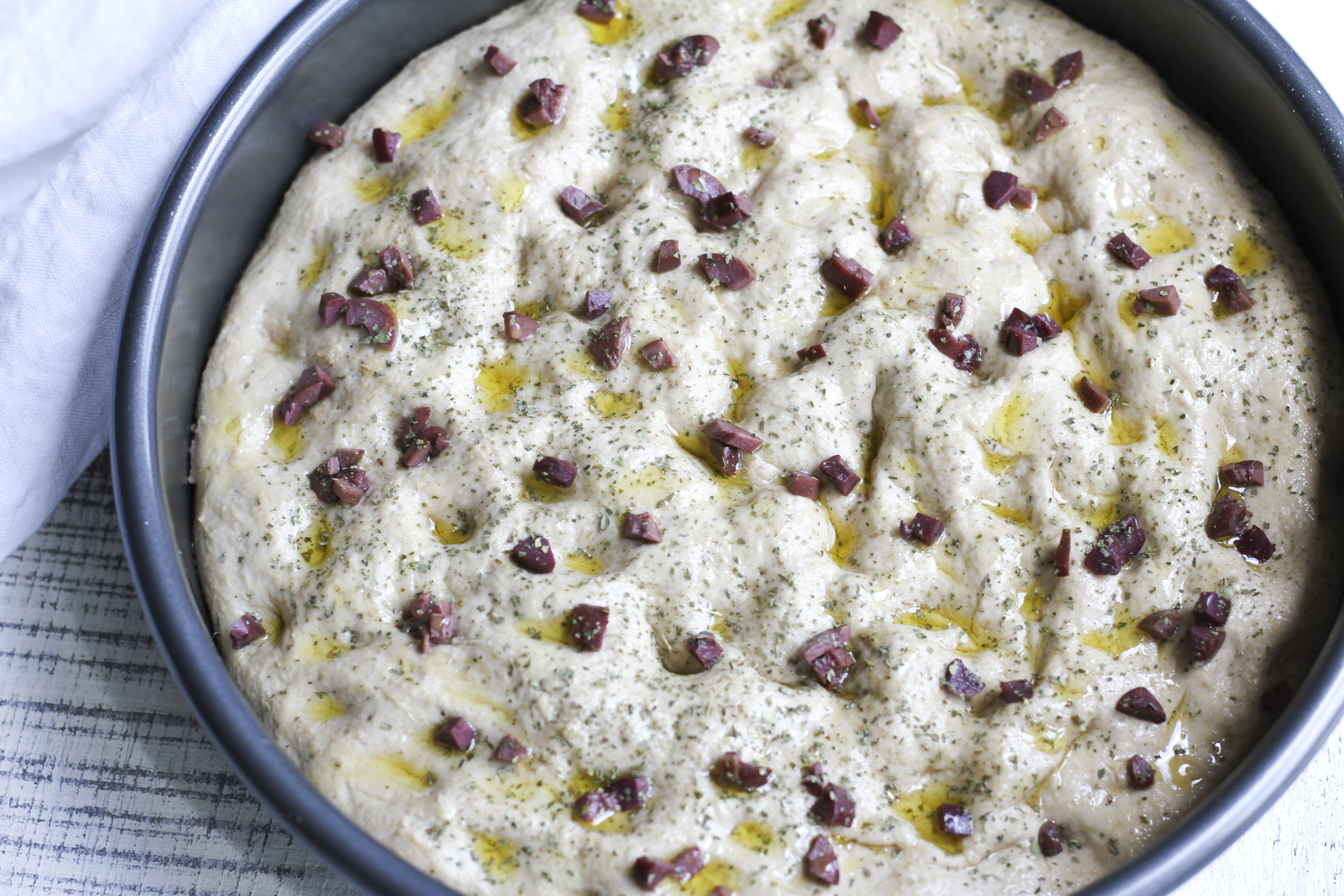 Cover the pan again and let the dough rise for 45 to 60 minutes, until it comes to the top of the pan. While the focaccia is rising, preheat the oven to 450°F.