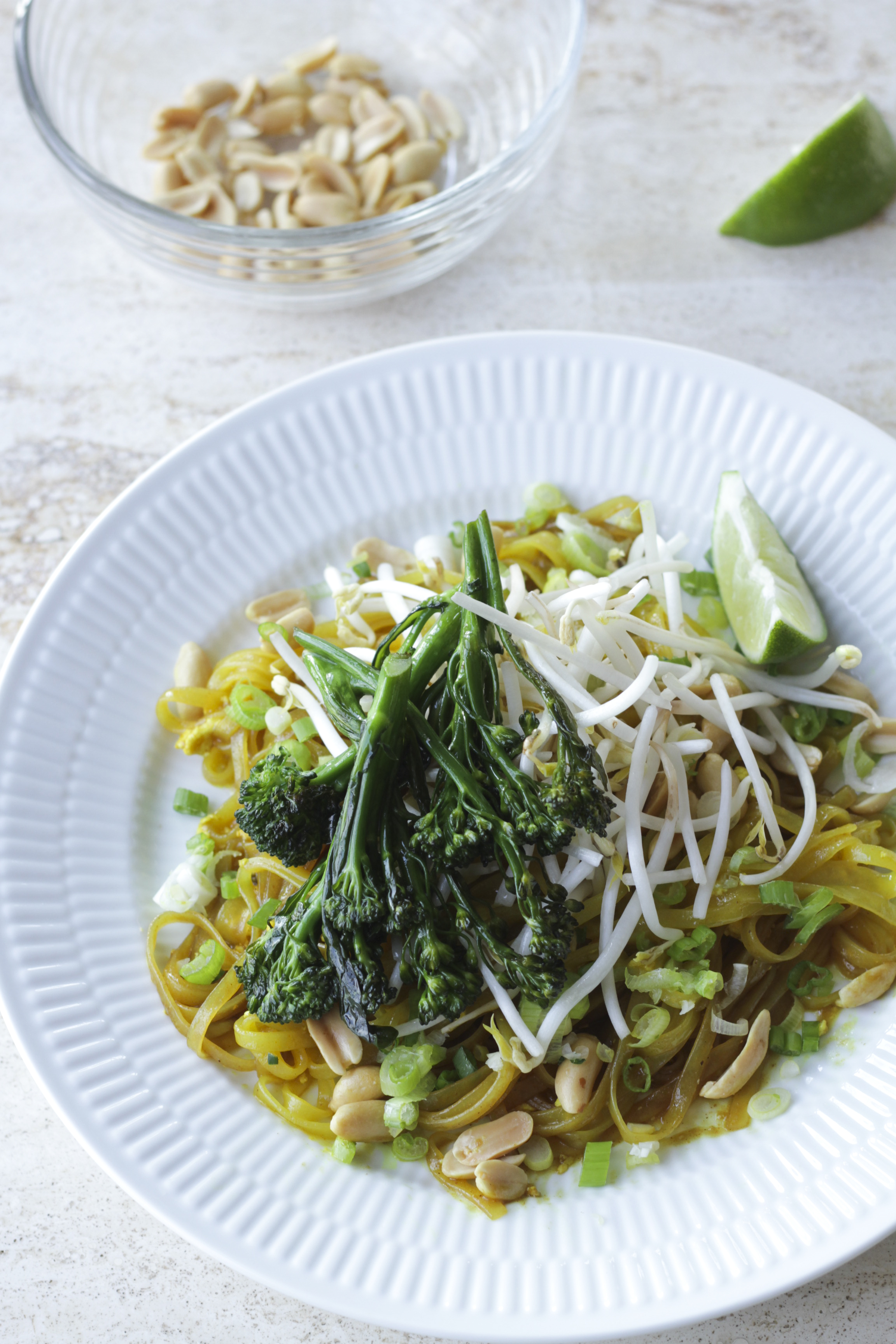 Push the noodles to the side, add the egg, whisk and break it up with the spatula, and allow it to set a bit, 10 or 20 seconds. Break it up, and toss the egg with the noodles. Add the bean sprouts, peanuts, and scallions. Transfer to a large platter and serve topped with the broccolini, and lime wedges.