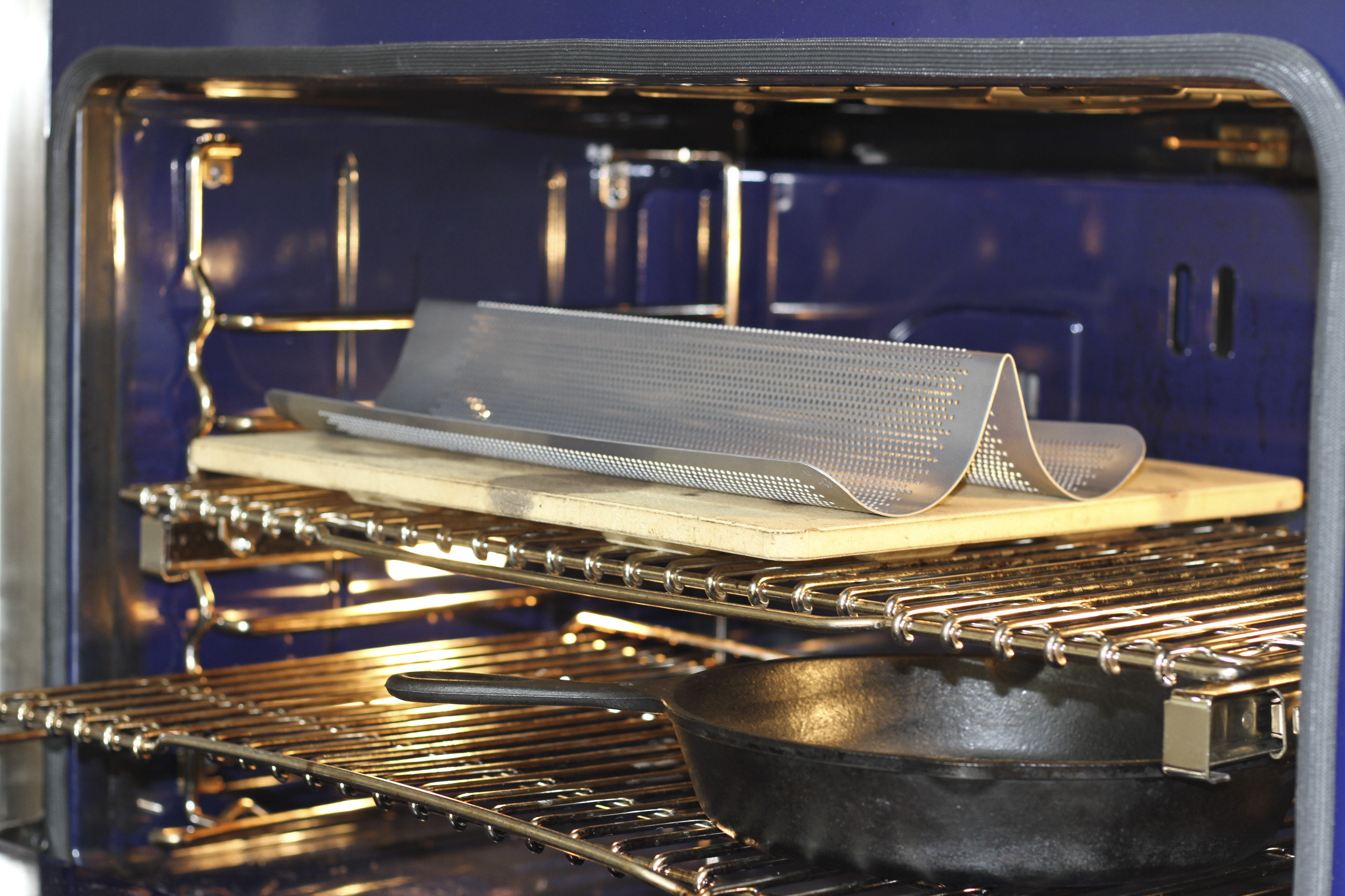 Load the baguette pan onto the hot stone in the oven. Carefully pour the boiling water into the cast iron pan, and quickly shut the oven door. The billowing steam created by the boiling water will help the baguettes rise, and give them a lovely, shiny crust.