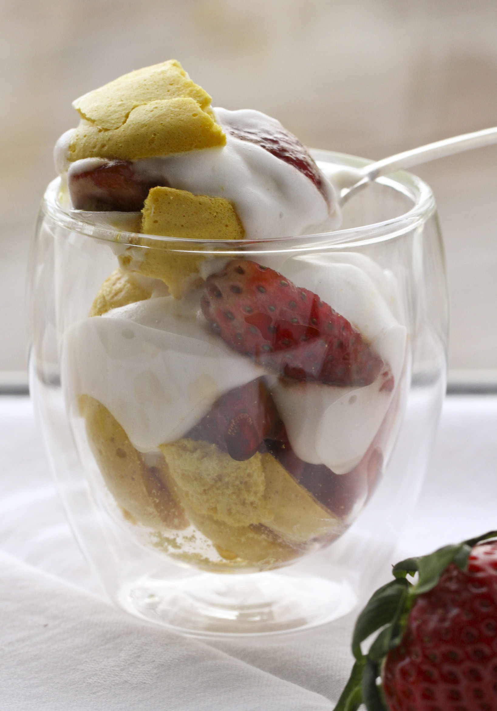Eton mess is first mentioned in print in 1893. It is commonly believed to originate from Eton College and is served at the annual cricket match. Although this berries and cream dessert has a long history, the vegan version, on the other hand, has a distinct ephemeral and delicate quality. The traditional method is, undoubtedly, sturdier. The vegan adaptation is best served and enjoyed as it is made. The longer it sits, the meringue and the vegan cream will go weepy. Or you can put the berries, meringue and the vegan cream in a separate bowl. Assemble by folding the berries into the cream and sprinkle broken pieces of meringue at the bottom or on the top of a glass.