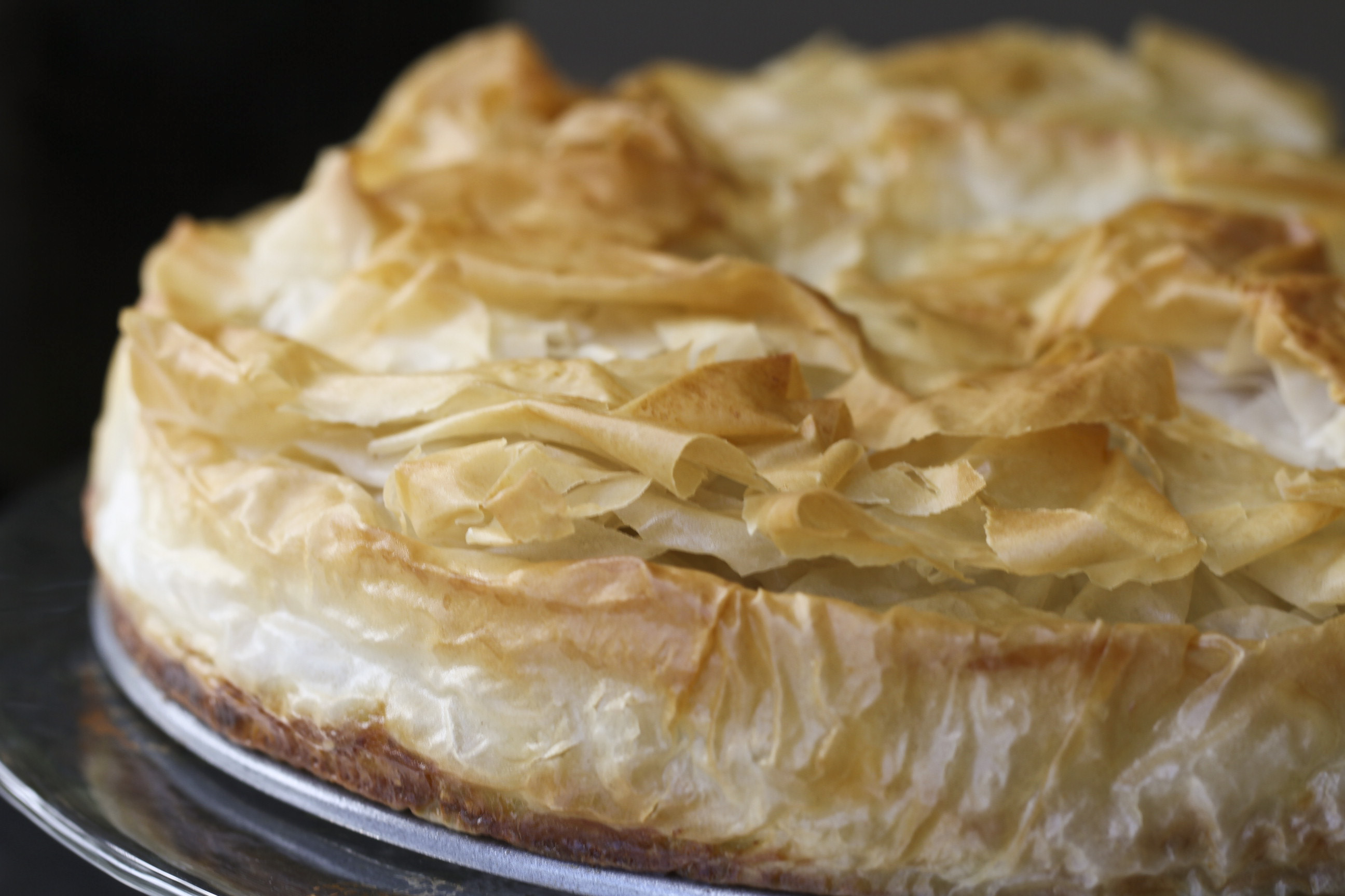 I had the finished pie sitting on the kitchen counter and my husband mistakenly thought this was a quiche. (One of our favorites.) He likes this filo pie a lot. It is light and all the ingredients gel together to make it enjoyable to eat. The crispy texture adds a lot to its appeal. You can hear the crunch as you cut into the pie. This is a fantastic and unusual pie with the combination of lovely taste, architecture and the crumbled look.