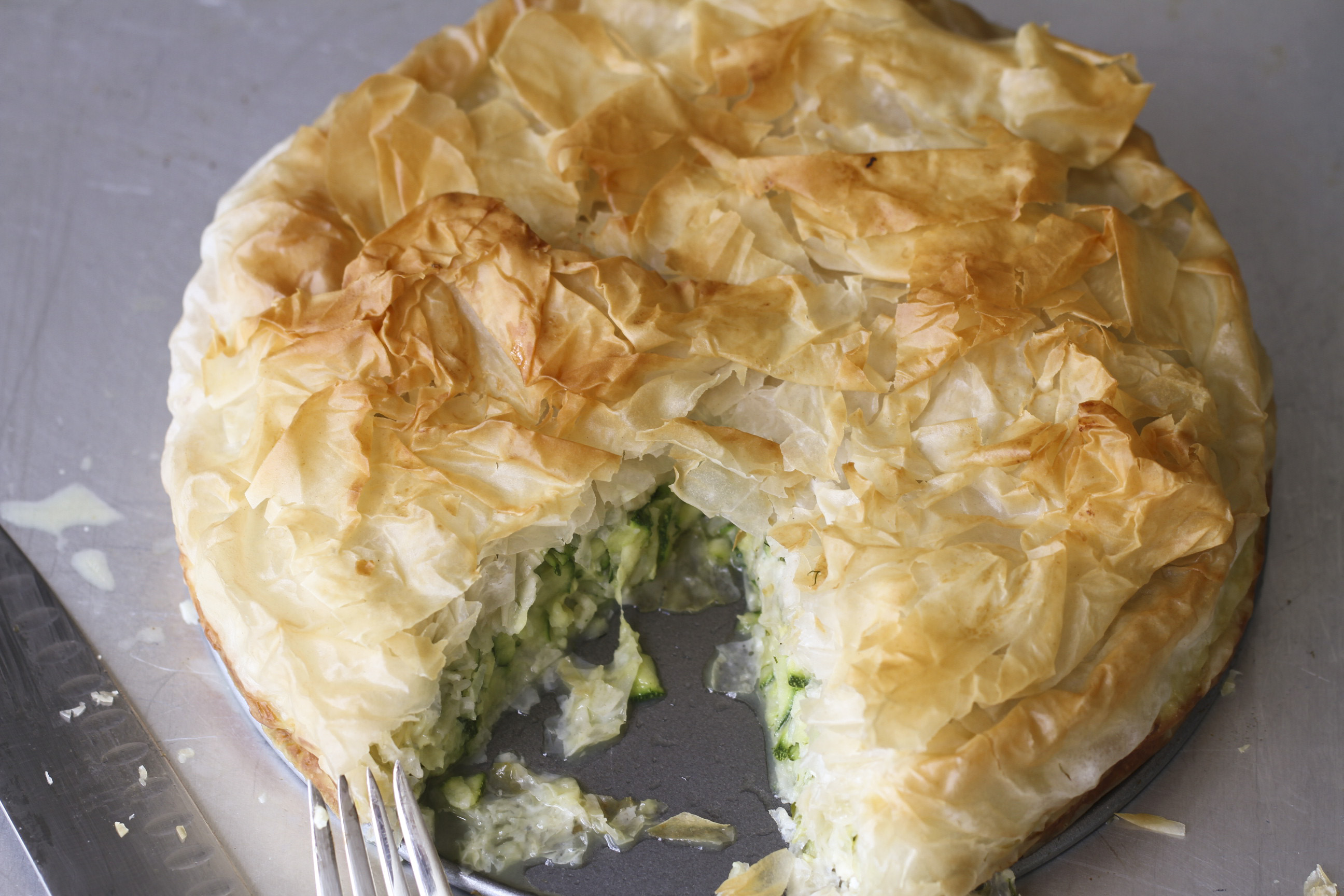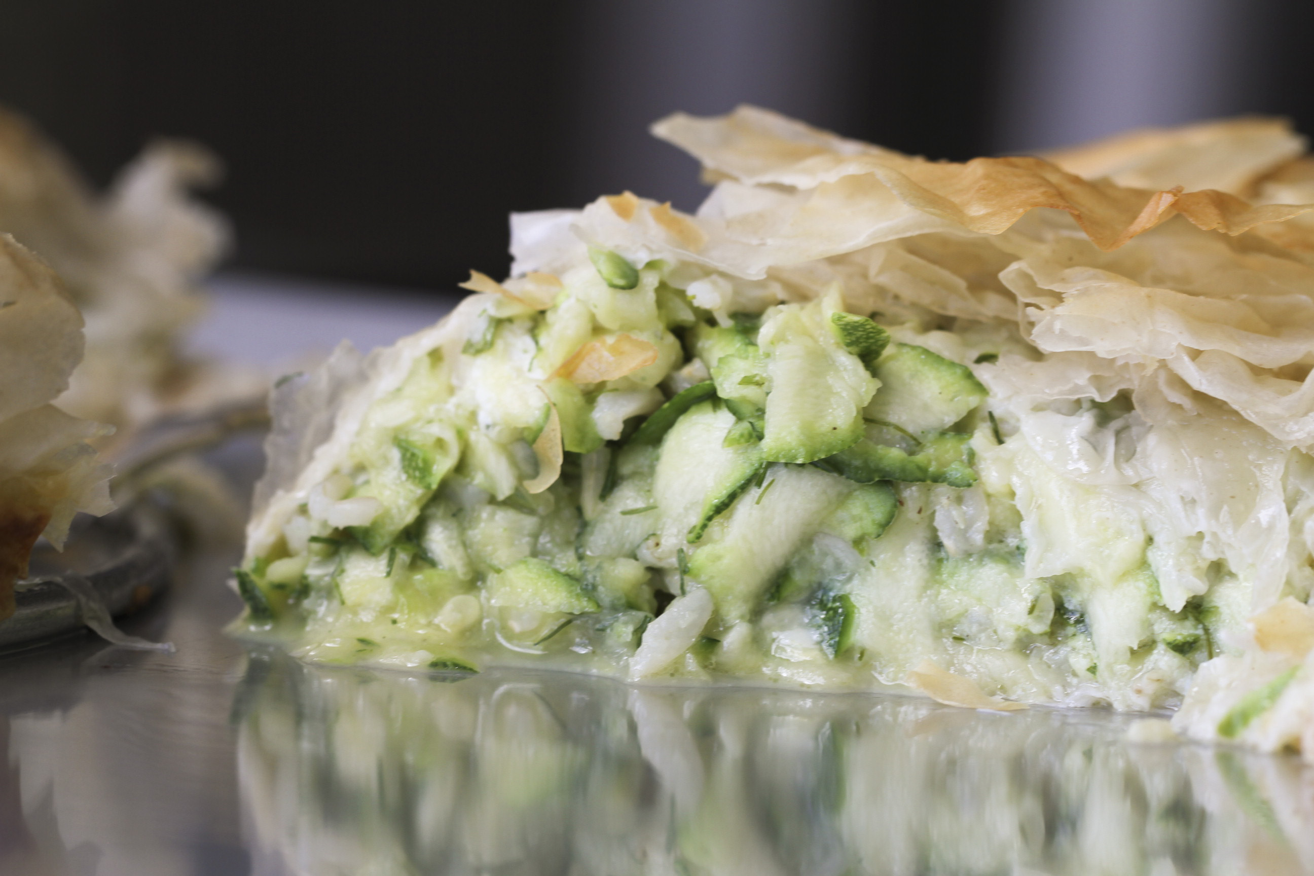 I may attempt to make something similar, a pie which is as light as air with a clean and delicate flavor. But I haven’t yet come up with any vegetable that works well as a blank canvas, like the zucchini, enclosed in a filo dough environment. You need a vegetable that softens quickly, without turning the inside of the pie waterlogged, meanwhile maintaining a crispy exterior. Making a good and well composed pie can be challenging. All I can cobble together for a similar attempt at a filo pie is a dessert, using berries and almond cream. Any suggestions?